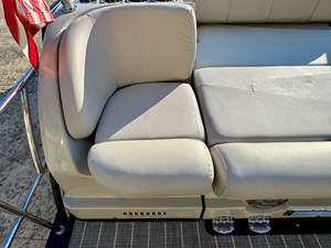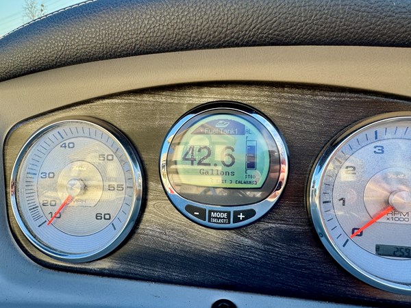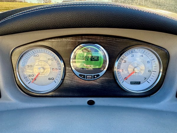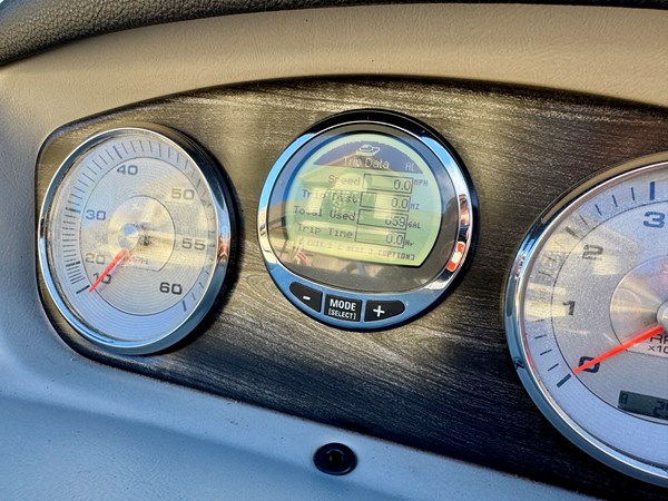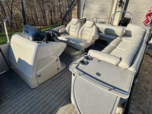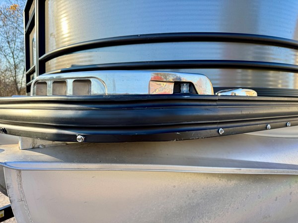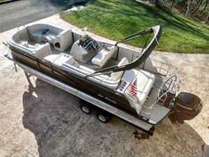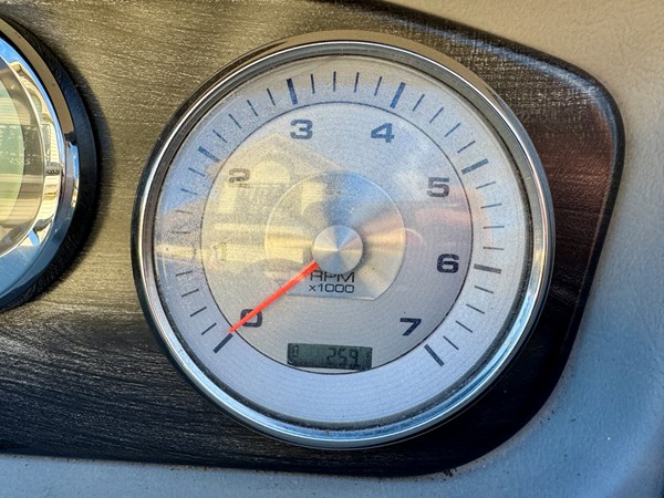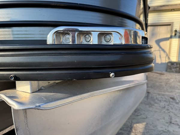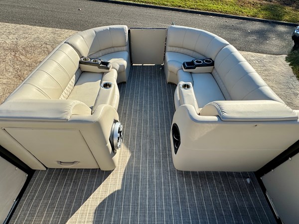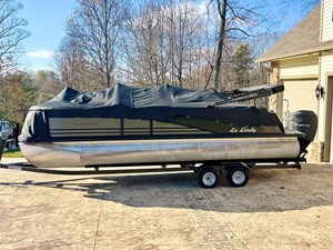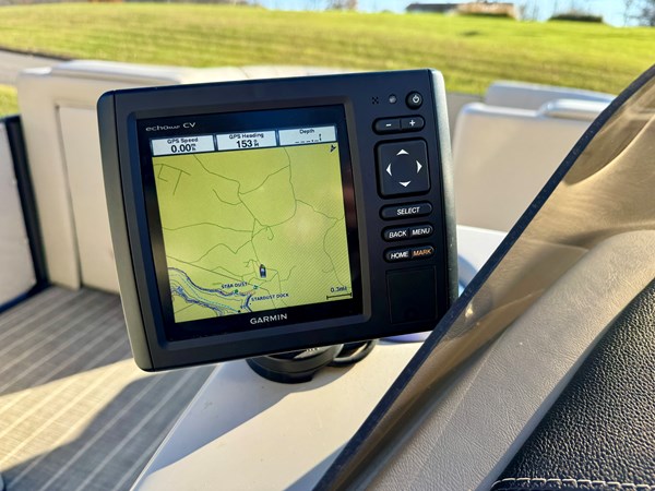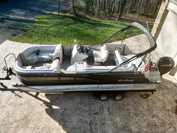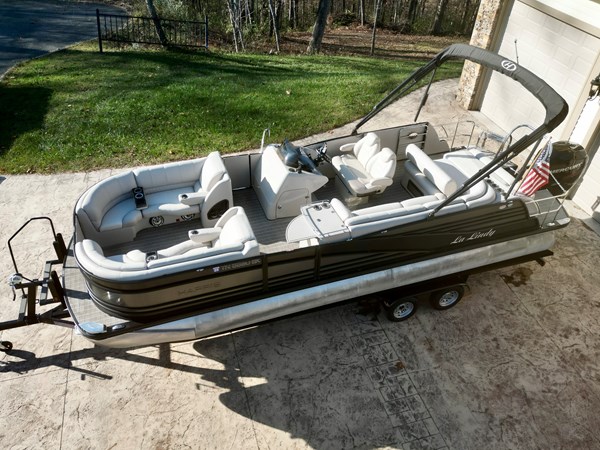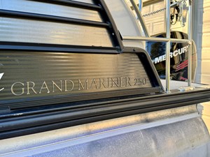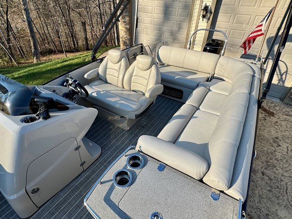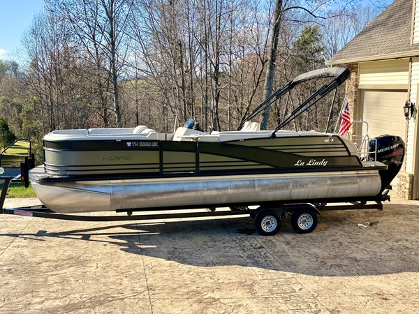 This Fresh Water 2016 Harris Grand Mariner 250 SLEC Tritoon For Sale near Norris Lake Tennessee is equipped with a 300HP Mercury Pro Verado 4-Stroke Super Charged Outboard Motor that provides a top speed over 45MPH and features the SLEC floorplan with a single rear lounge with entertainment center, the performance level 3 upgrade, a ski tow bar, 12' bimini top, mooring cover w/EZ clips, aluminum under skin, 6'' lifting strakes, 25'' diameter pontoons, pillow top upholstery upgrade, woven vinyl sea grass flooring, a garmin gps/chartplotter/depth/fish finder, mercury smartcraft mercmonitor gauge with integrated engine and fuel economy data, mercury's digital throttle and shift controller (DTS), power assisted steering, a double-lux driver's helm seat with upgraded euro tilt steering wheel, pull-out under helm storage drawer, an upgraded polk audio diamond stereo package with (8)speakers, (2)amps, a subwoofer, and 3 stereo remotes, (3)integrated self-draining ice chests, upholstered interior fence panels, (19)total cupholders, a lighting package with docking, interior/courtesy, cupholders, bimini top, swim ladder, and exterior under deck lights, a 2024 tandem axle trailer with brakes is included and much more!