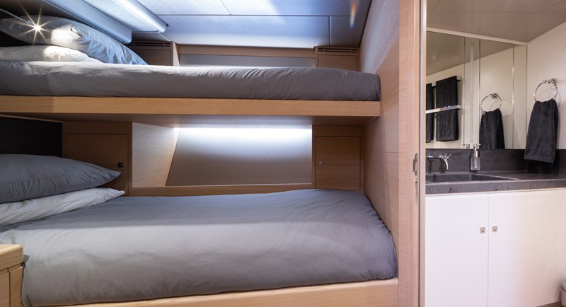Liara sleeps 8 guests in 4 luxuriously appointed ensuite cabins. Consisting of the owners double suite forward, a double VIP cabin midships and two twin cabins aft of the saloon. There are also 3 dedicated crew cabins aft which sleep 5 in total