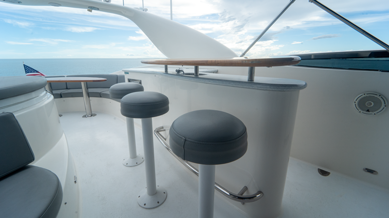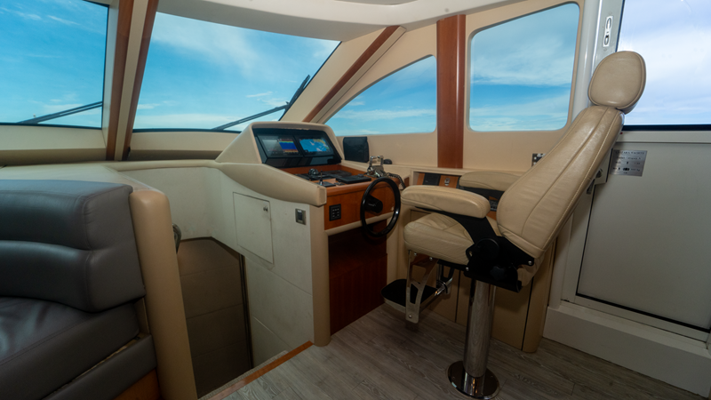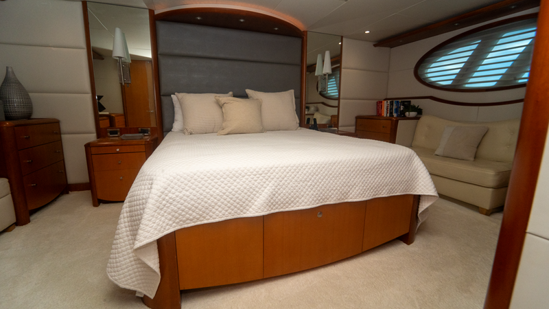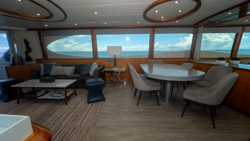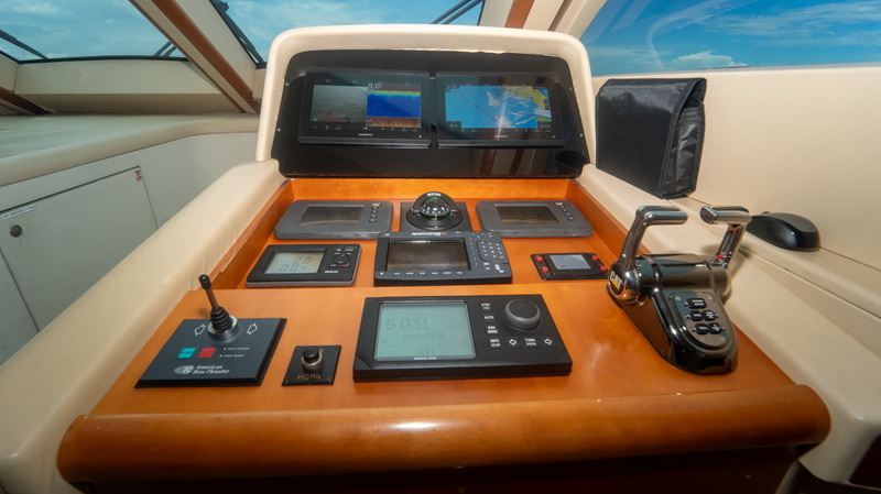 “Living the Dream” boasts a luxurious interior that combines elegance with functionality. The salon is spacious and well-appointed, providing a comfortable setting for relaxation and entertainment. The yacht is equipped with modern amenities, including updated Garmin electronics, a vast engine room, and options like twin Onan 27.5 kW generators