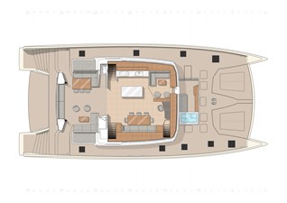 The layout includes expansive living areas and bright interiors. The flybridge version includes a navigation station, sheltered bar, and lounge seating. An enclosed wheelhouse layout is also available. The foredeck includes a Jacuzzi and seating area, while the aft platform carries a large tender and space for water toys.