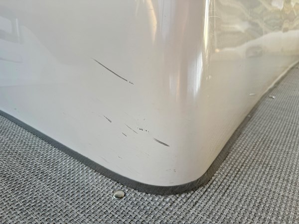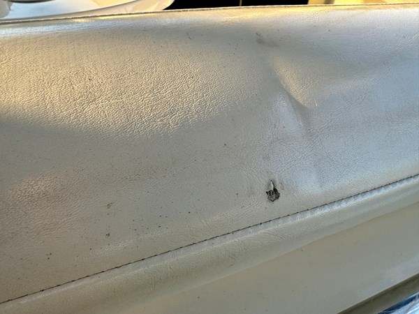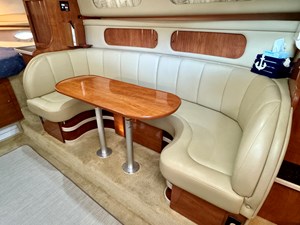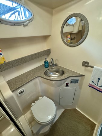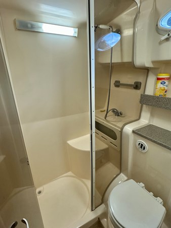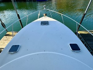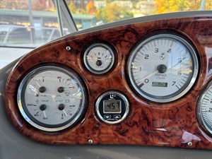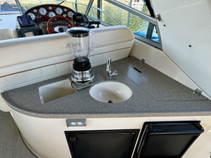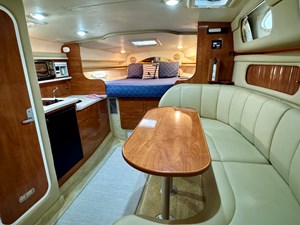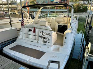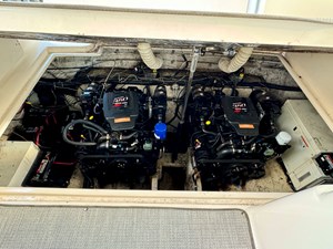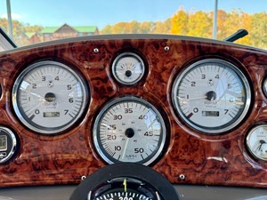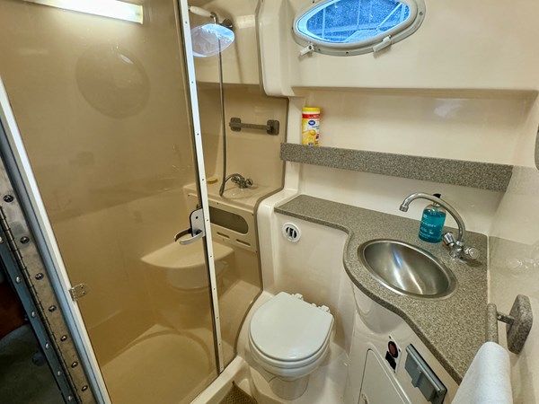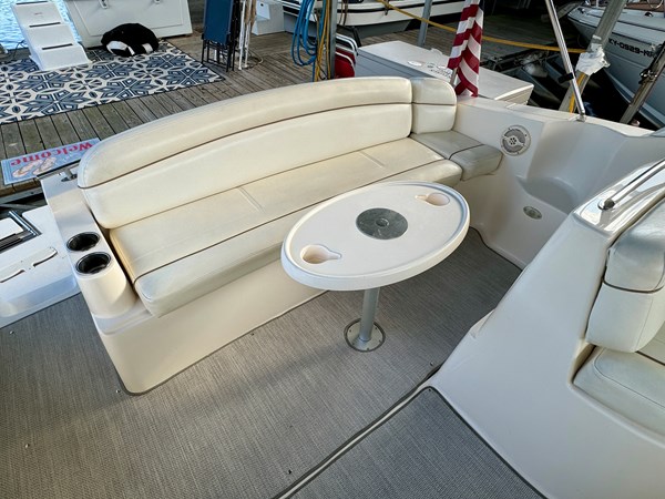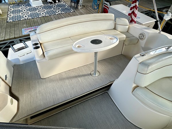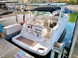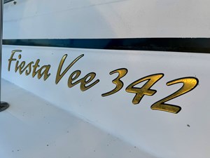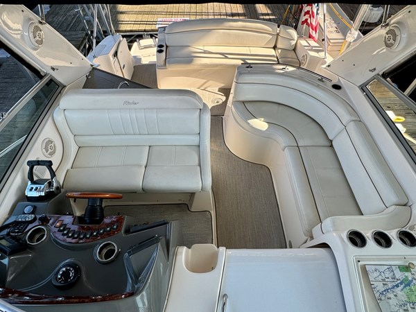 This Fresh Water 2004 Rinker Fiesta Vee 342 Cabin Cruiser For Sale on Norris Lake Tennessee is powered by twin Mercruiser 350MAG MPI V8 Inboard/Outboard Engines with Bravo III Dual Prop Outdrives and a Kohler Generator in a soundbox and features sleeping for 5-6 in a v-berth, convertible dinette, and a mid cabin with a roomy head that has a separate shower stall, an electric flush head, and a vanity sink. The cabin's 6' 10'' of headroom is heated and cooled with a marine air conditioning unit with reverse cycle heat while other creature comforts are provided via the galley's ac/dc refrigerator, dual electric range cooktop, an integrated microwave, coffee maker, and sink with a 24'' LED smart roku tv integrated into a cabinet for rainy days or cloudy evenings. In the cockpit you'll find another ac/dc fridge as well as an under-counter freezer, integrated blender and waste bin. Comfort is assisted in the cockpit by an overhead dual bimini top that includes an isenglass/camper canvas enclosure, woven vinyl snap-in flooring is underfoot, and a removable lounge table, stereo, and plenty of stainless cupholders throughout allow for easy entertaining. At the helm you'll find a double wide helm seat with driver bolster, a depth/fish finder/sonar, gps chartplotter/radar, vhf radio, controls for a remote spotlight, windlass anchor, hydraulic trim tabs with an indicator, and much more. Other highlights include a central vacuum system, a bow sunpad cushion, an extended swim platform with swim boarding ladder, and a hot/cold transom shower. The covered slip on Norris Lake Tennessee is transferable.