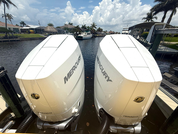 Powerful Performance: Equipped with twin Mercury V10 400 outboards (800 HP total) for exhilarating speed and smooth handling, complete with Mercury Helm Master EX for precision control. 100 hour service just completed.