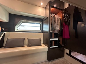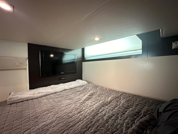 The stateroom is spacious and features a double berth, large settee, flatscreen TV, storage and a hanging locker. An additional double berth is created by lowering the table and adding custom cushions. Lastly, both the port and starboard backrests flip upward to create two single berths. This boat will comfortably sleep six!!