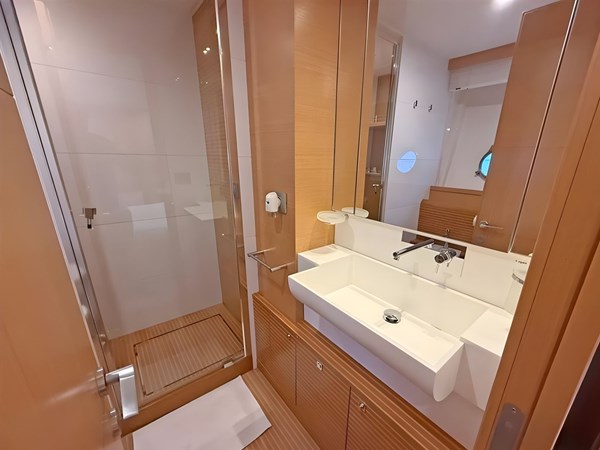 Accommodating 8 guests in four ensuite cabins and three crew members in two separate quarters, she is the ideal motor yacht for both private and commercial use. The generous exterior spaces from the cockpit and the hydraulic swim platform to the impressive flybridge and the bow sunbathing area are combined with interior spaces filled with natural light, not only in the salon, but also in the cabins.