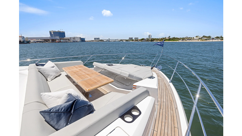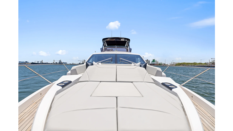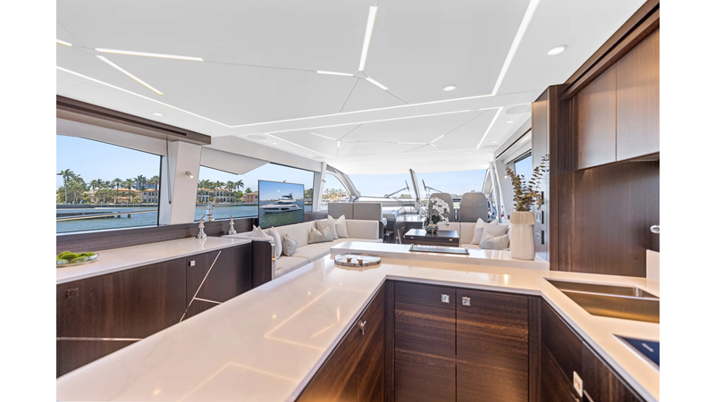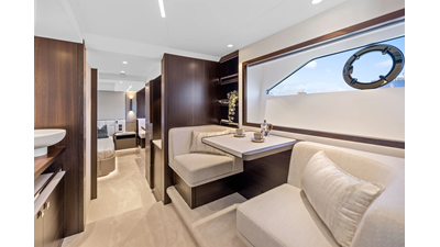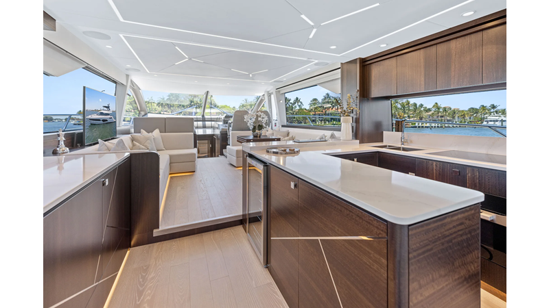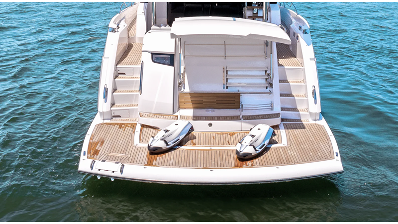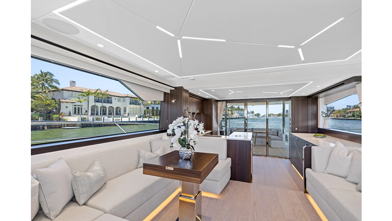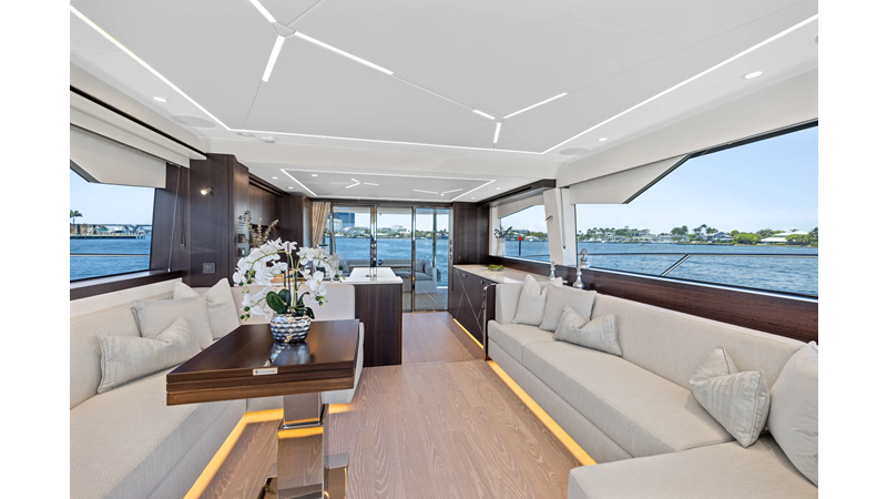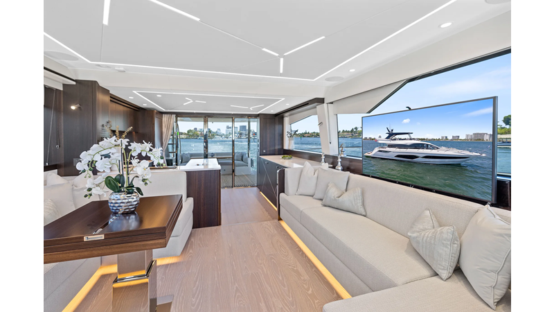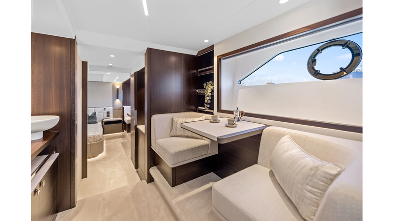 Throughout the main deck, there is a strong focus on creating generous, usable sociable spaces. The exterior lines flow effortlessly from the Portuguese-bridge bow seating and sunbathing areas to the expansive cockpit adjoining an innovative Beach Club with enhanced features, including a dedicated water level locker for two SeaBobs, delivering effortless enjoyment. Internally, the expansive main saloon benefits from sweeping glazing, extending below the TV console, revealing glimpses of the sea from all perspectives.
