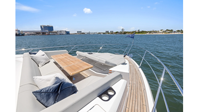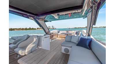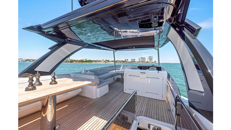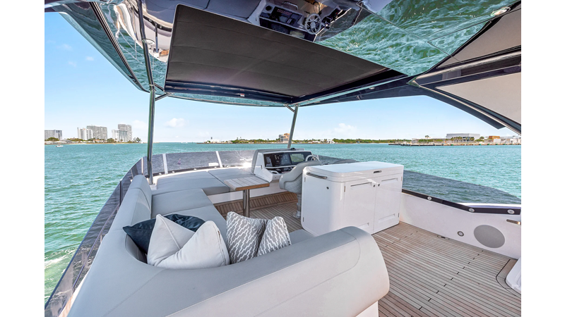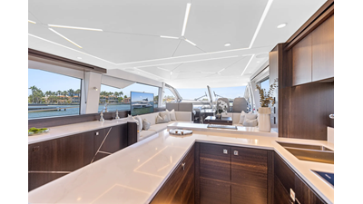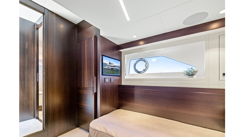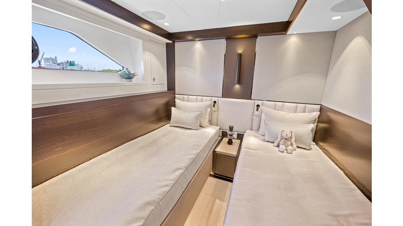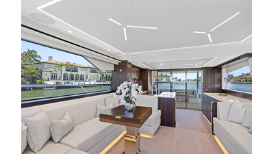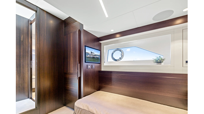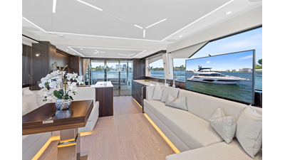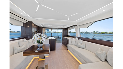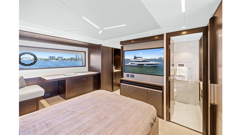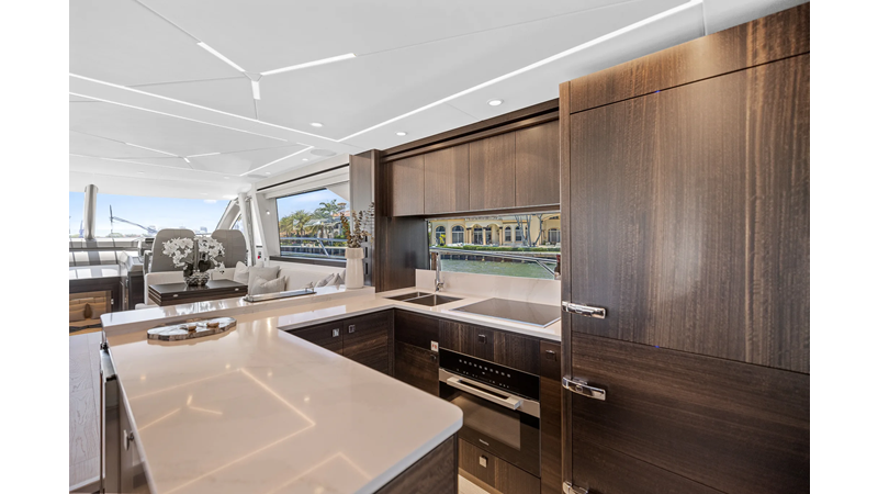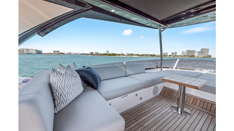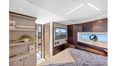 Throughout the main deck, there is a strong focus on creating generous, usable sociable spaces. The exterior lines flow effortlessly from the Portuguese-bridge bow seating and sunbathing areas to the expansive cockpit adjoining an innovative Beach Club with enhanced features, including a dedicated water level locker for two SeaBobs, delivering effortless enjoyment. Internally, the expansive main saloon benefits from sweeping glazing, extending below the TV console, revealing glimpses of the sea from all perspectives.