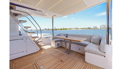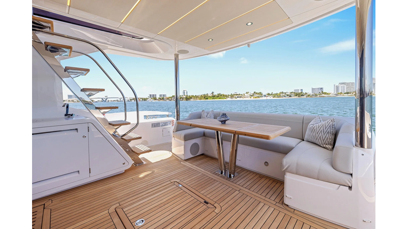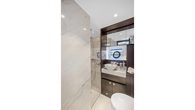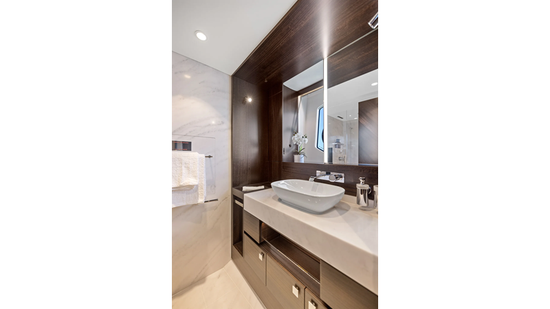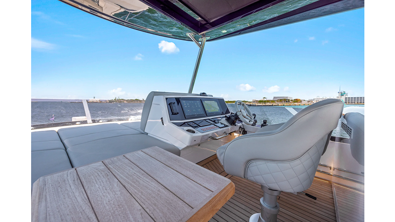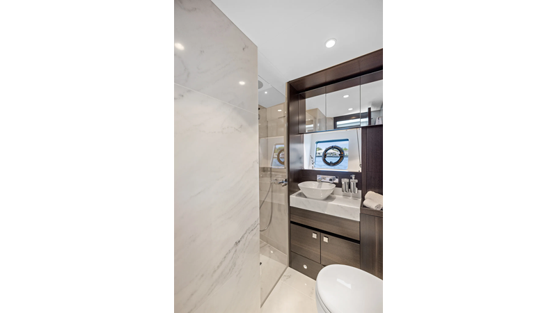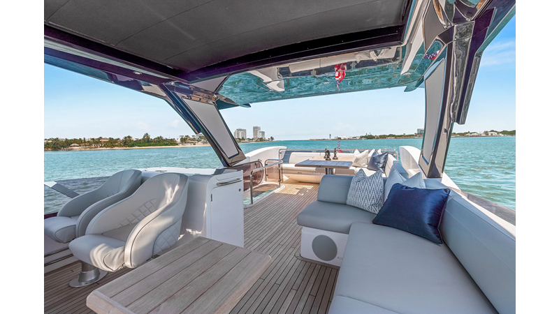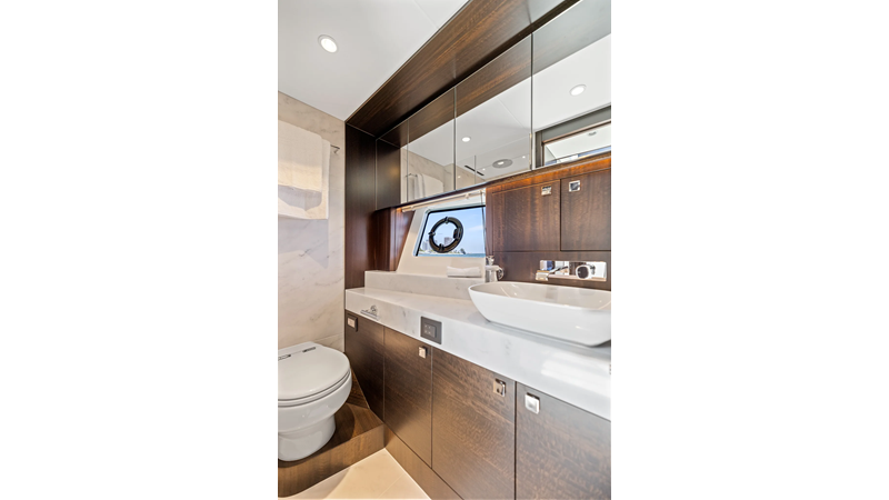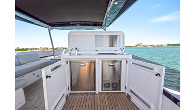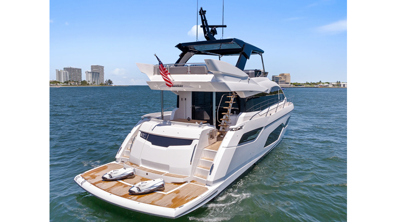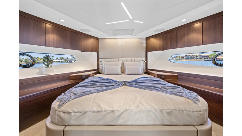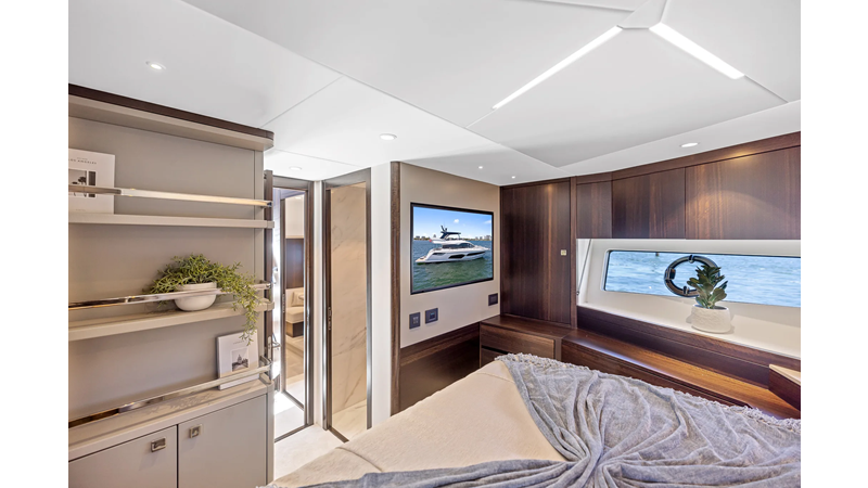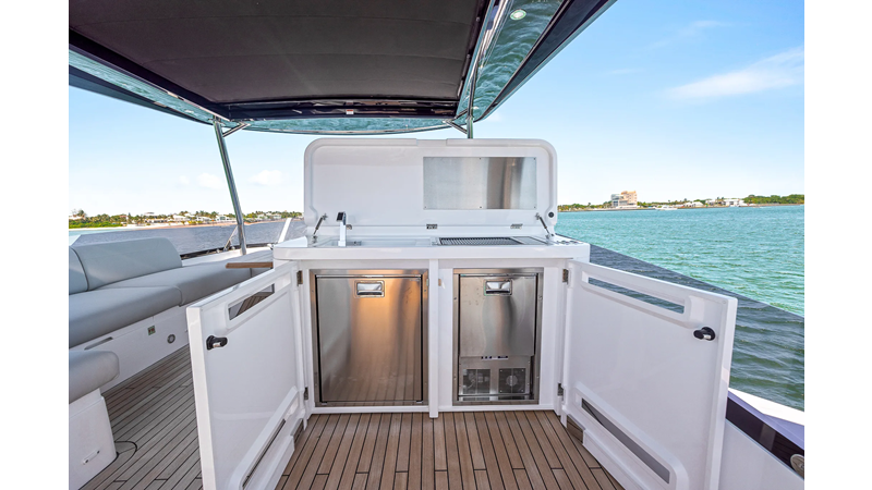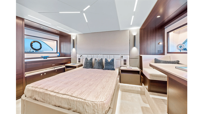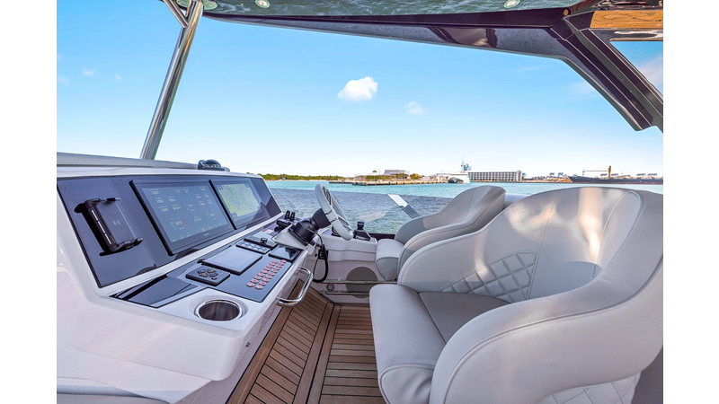 The fully-equipped aft galley with a large dinette links seamlessly to the cockpit via full-width sliding doors, helping to bring everyone together. The innovative design layout allows yachting owners to welcome guests with a strong focus on ambient lighting and interior detailing. Access to the spacious guest and master cabins is via the lower helm and elevated companion seating. The interiors boast exquisite attention to detail with a new palate of upholstery that provides a cool, crisp, and contemporary look, unmistakably a Manhattan.