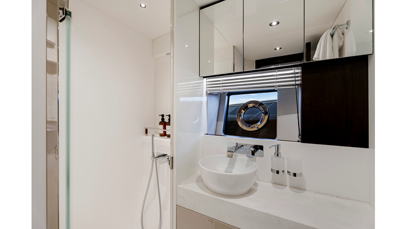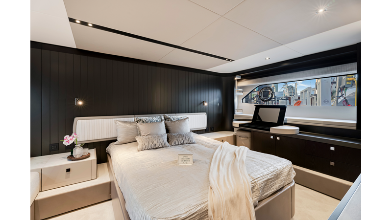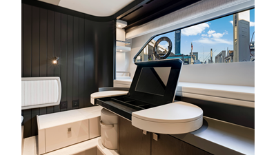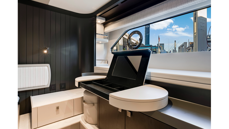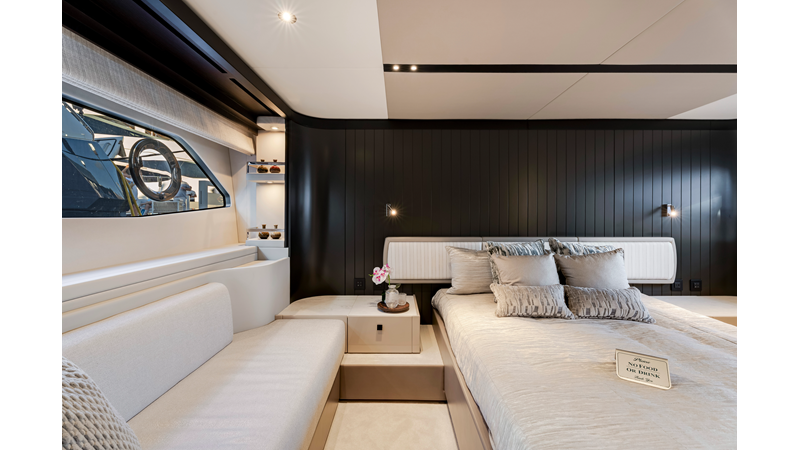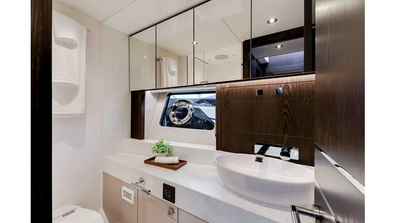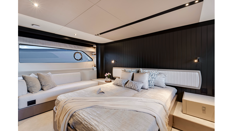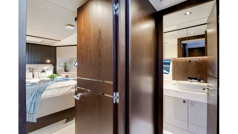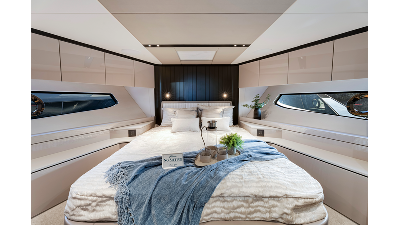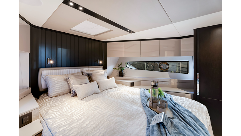 The fully-equipped aft galley with a large dinette links seamlessly to the cockpit via full-width sliding doors, helping to bring everyone together. The innovative design layout allows yachting owners to welcome guests with a strong focus on ambient lighting and interior detailing. Access to the spacious guest and master cabins is via the lower helm and elevated companion seating. The interiors boast exquisite attention to detail with a new palate of upholstery that provides a cool, crisp, and contemporary look, unmistakably a Manhattan.