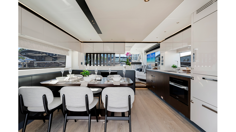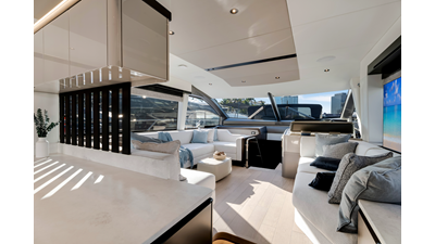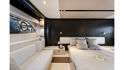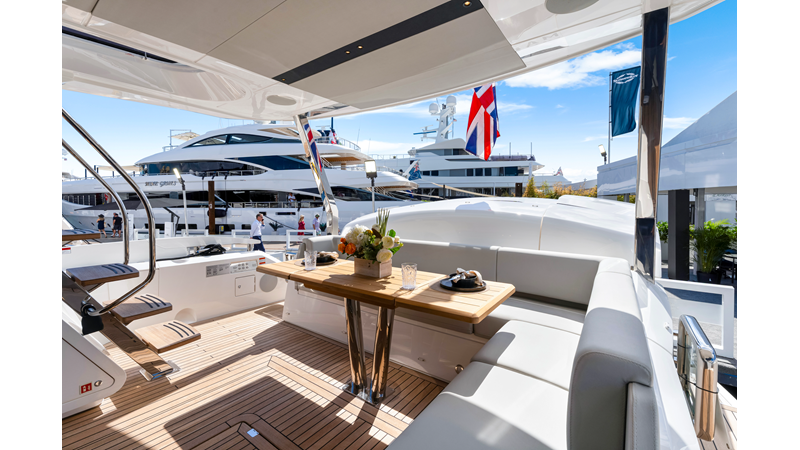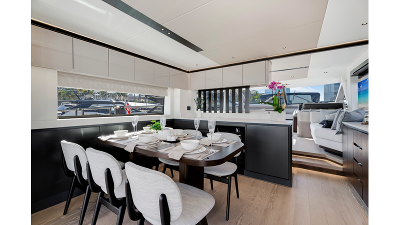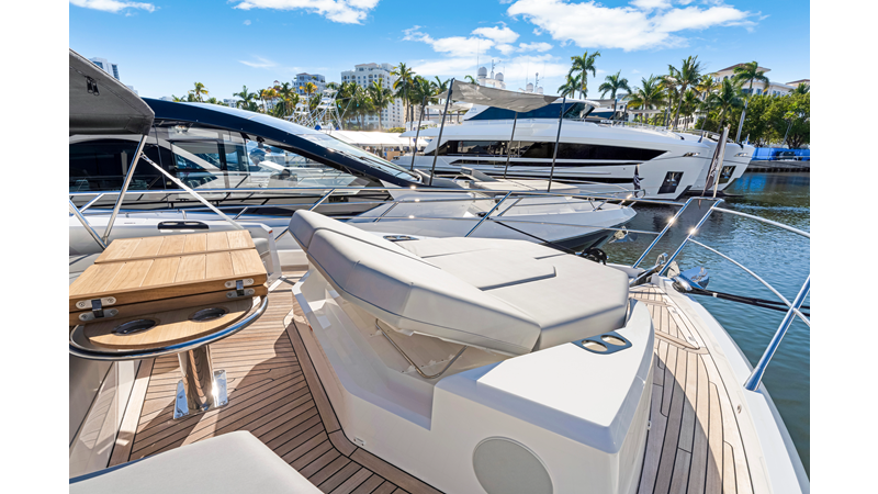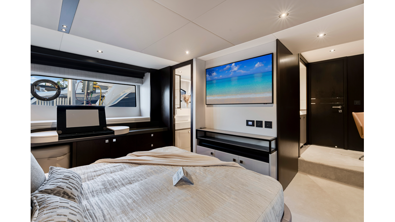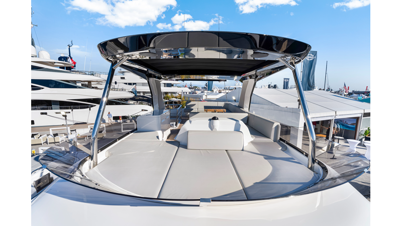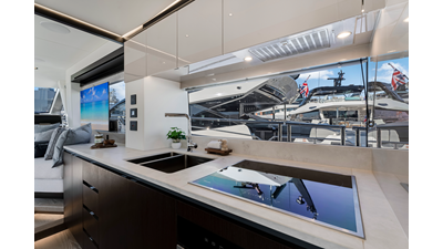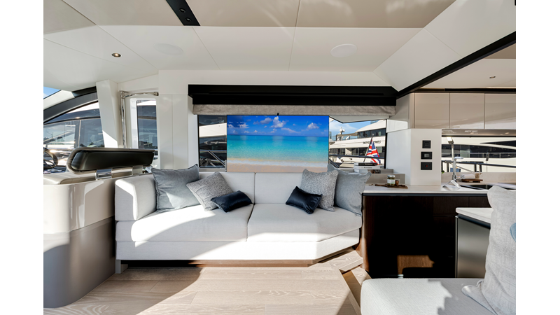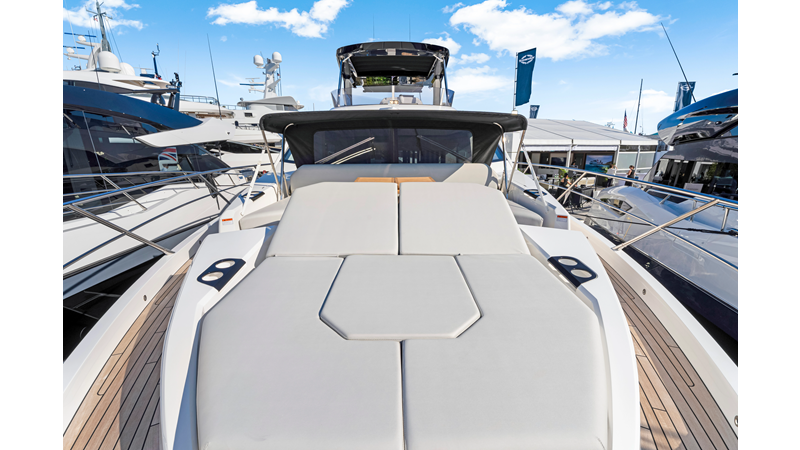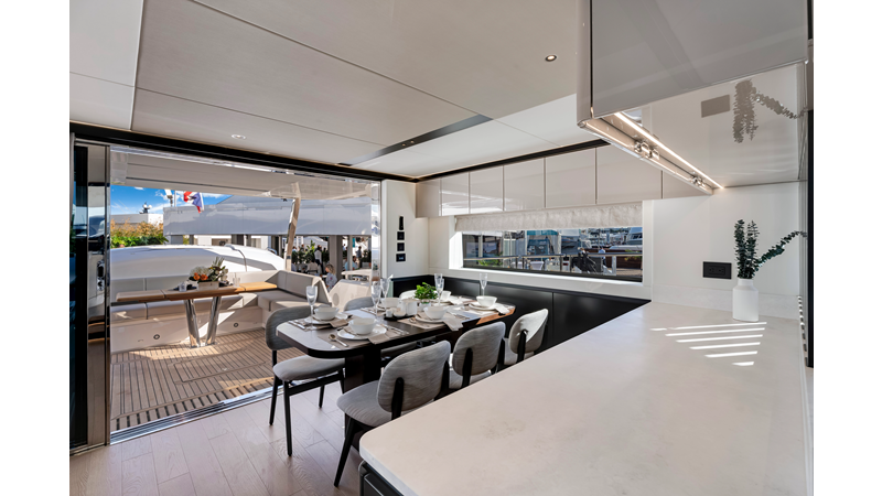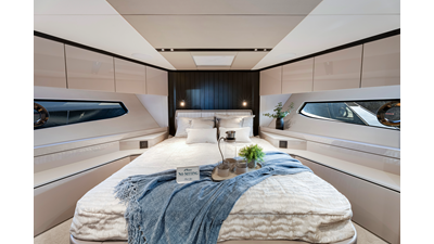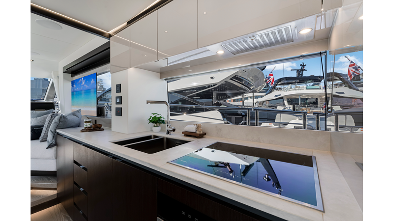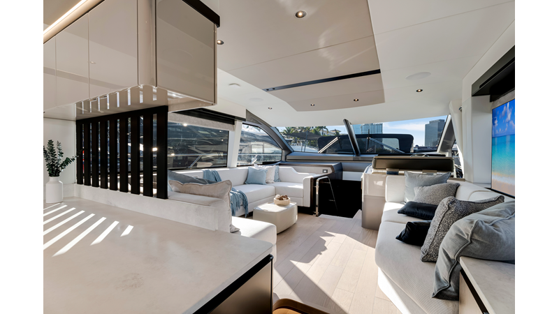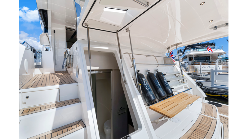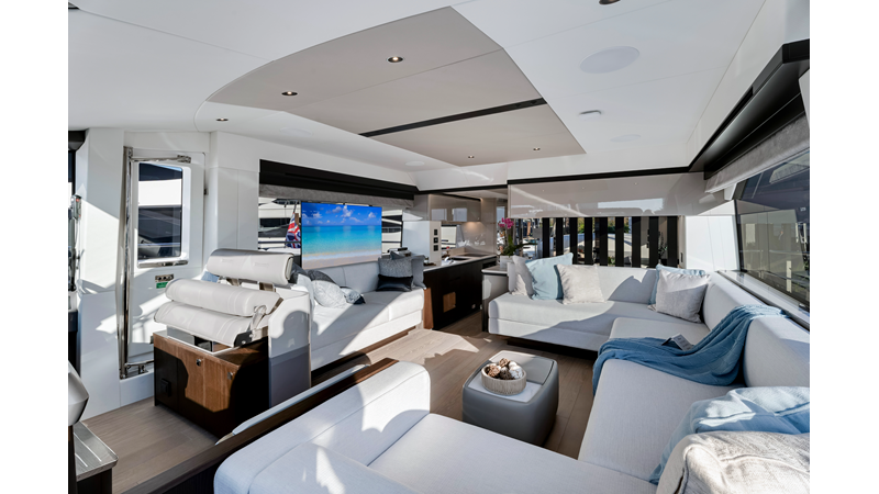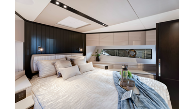 Throughout the main deck, there is a strong focus on creating generous, usable sociable spaces. The exterior lines flow effortlessly from the Portuguese-bridge bow seating and sunbathing areas to the expansive cockpit adjoining an innovative Beach Club with enhanced features, including a dedicated water level locker for two SeaBobs, delivering effortless enjoyment. Internally, the expansive main saloon benefits from sweeping glazing, extending below the TV console, revealing glimpses of the sea from all perspectives.