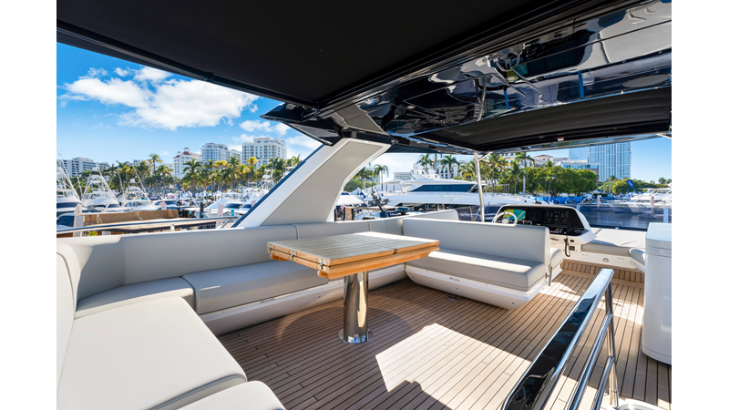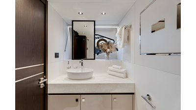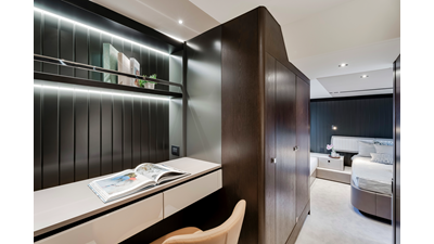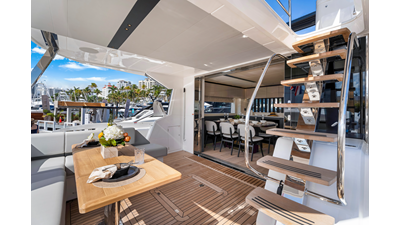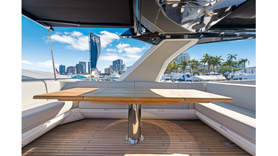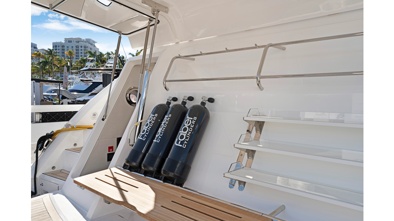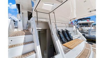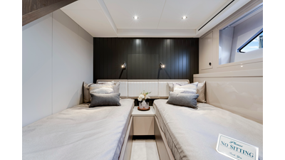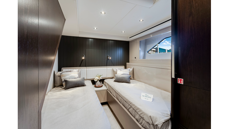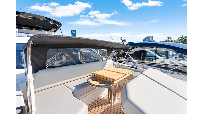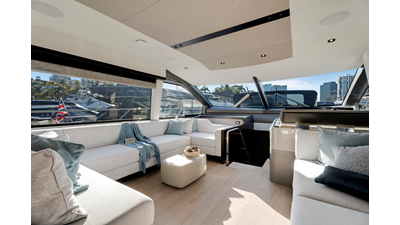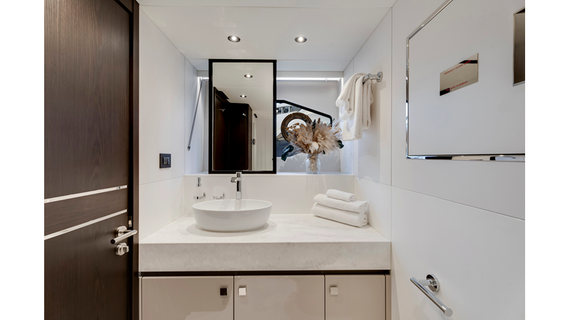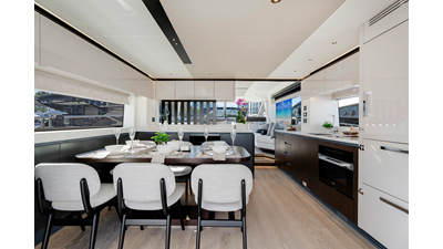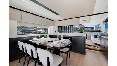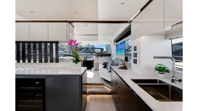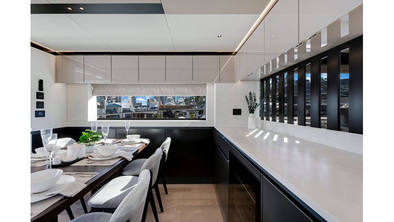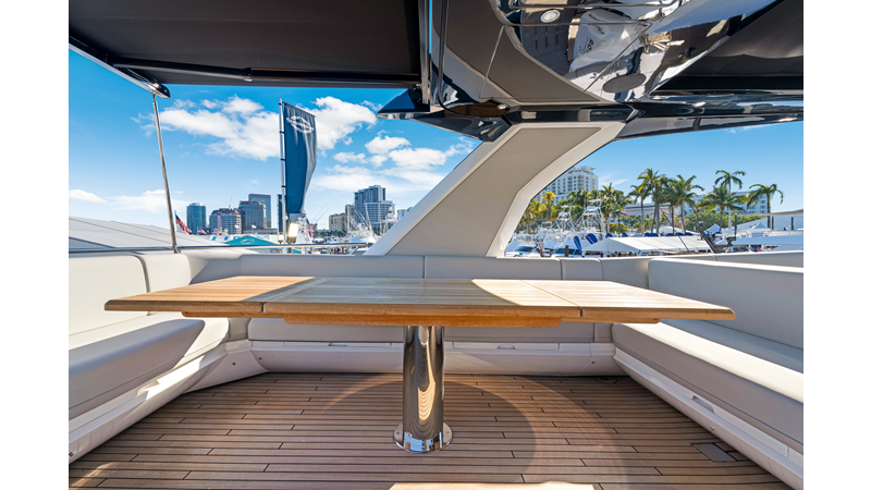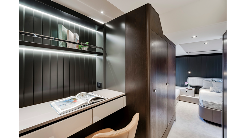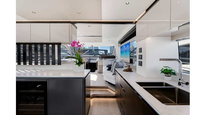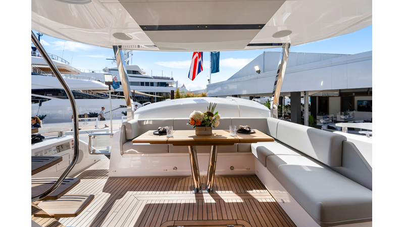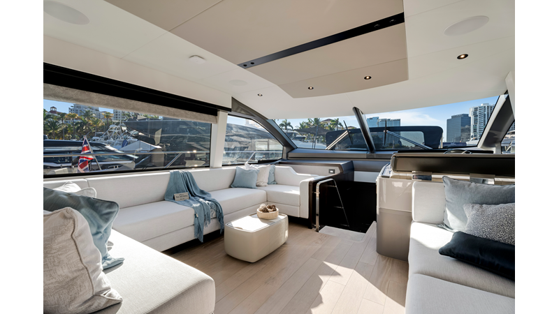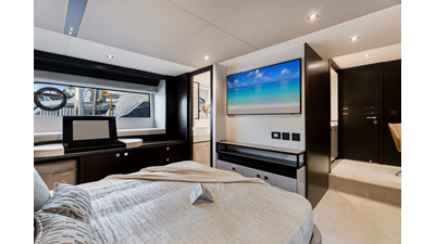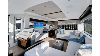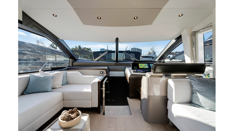 Throughout the main deck, there is a strong focus on creating generous, usable sociable spaces. The exterior lines flow effortlessly from the Portuguese-bridge bow seating and sunbathing areas to the expansive cockpit adjoining an innovative Beach Club with enhanced features, including a dedicated water level locker for two SeaBobs, delivering effortless enjoyment. Internally, the expansive main saloon benefits from sweeping glazing, extending below the TV console, revealing glimpses of the sea from all perspectives.