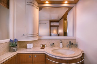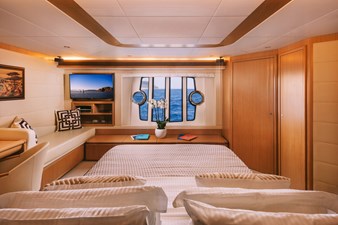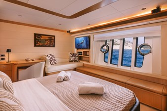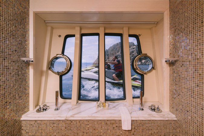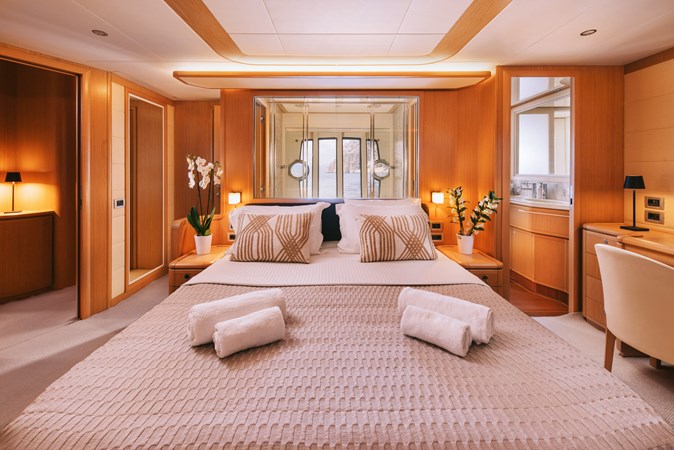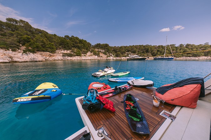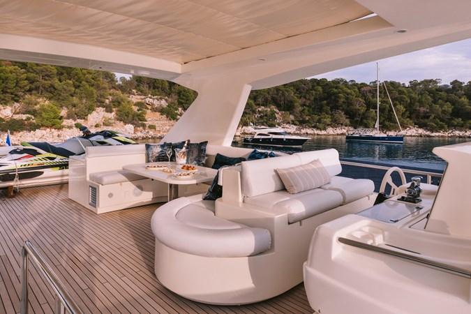 She boasts a full beam master suite with floor-to-ceiling windows and is equipped with zero-speedstabilisers, beach club, a large flybridge with wetbar, and a plethora of toys.