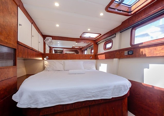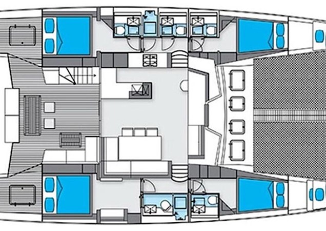 Accommodation includes four ensuite double cabins for eight guests plus two crew forepeaks. The open-plan saloon/galley connects directly to the aft cockpit, with air conditioning throughout. Galley includes fridge/freezer, oven, microwave, and coffee machine.