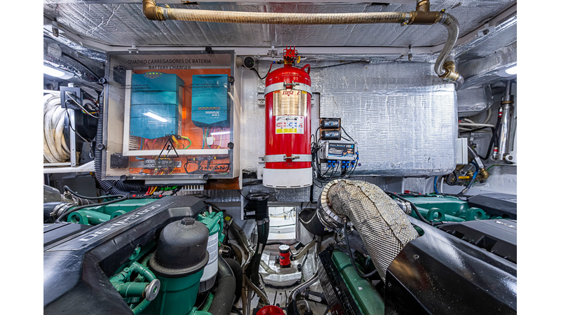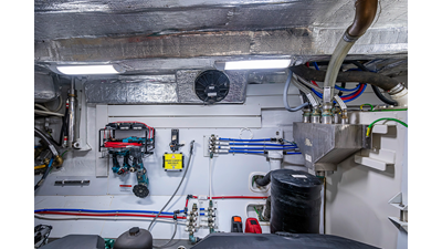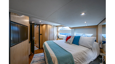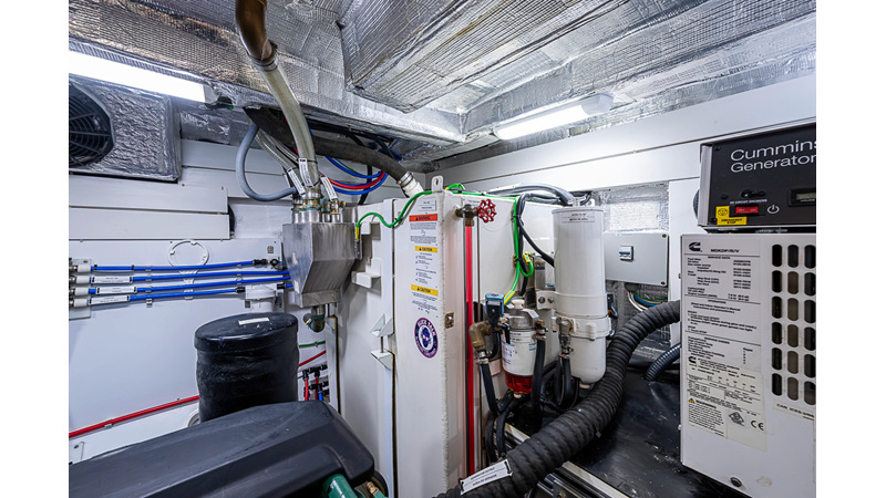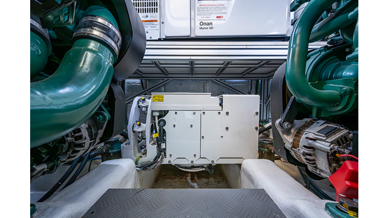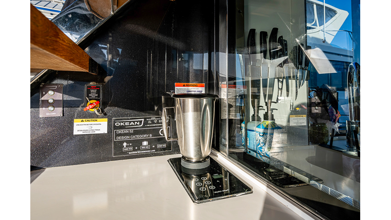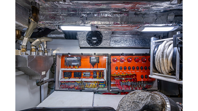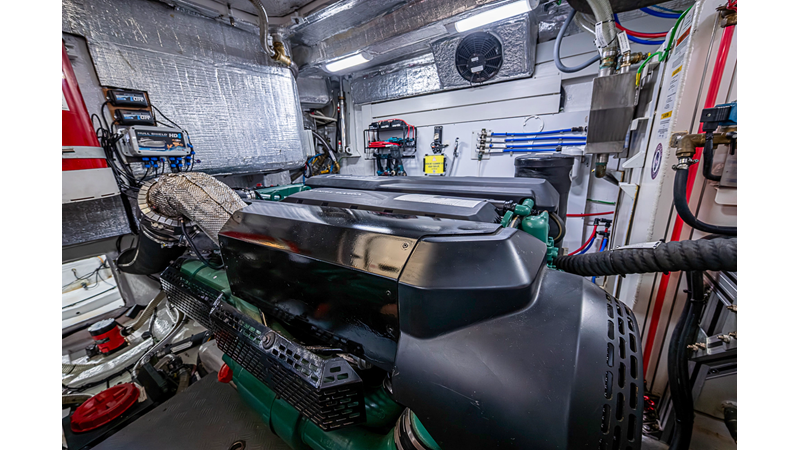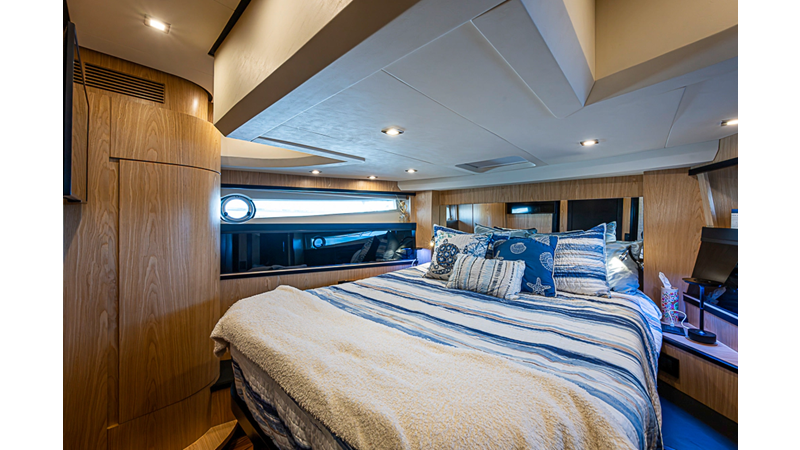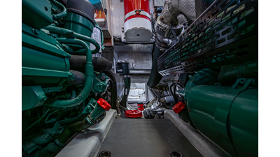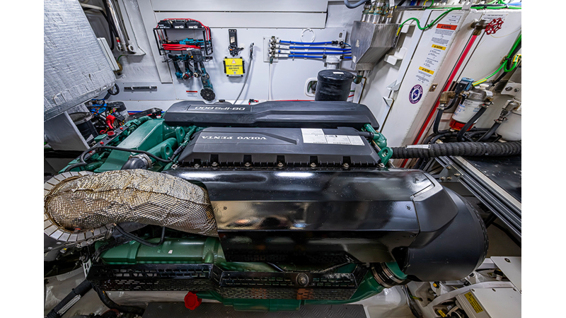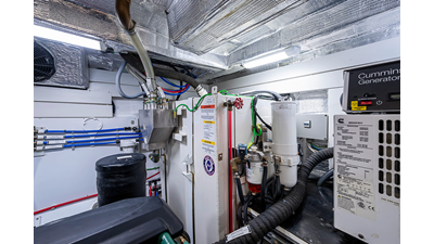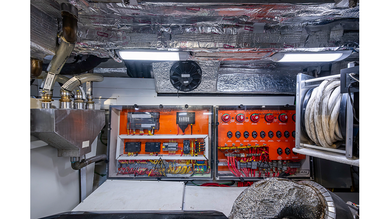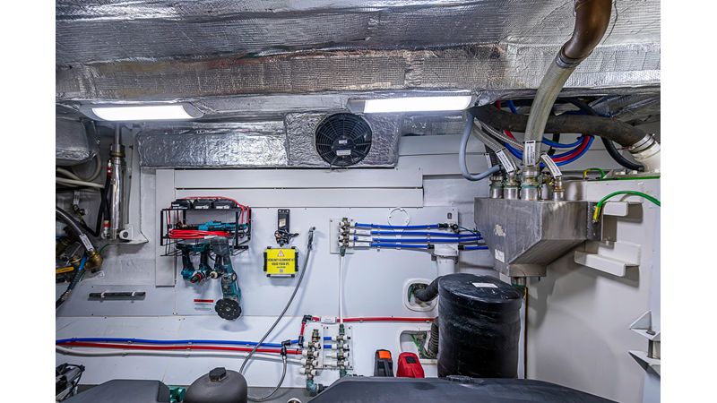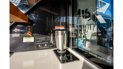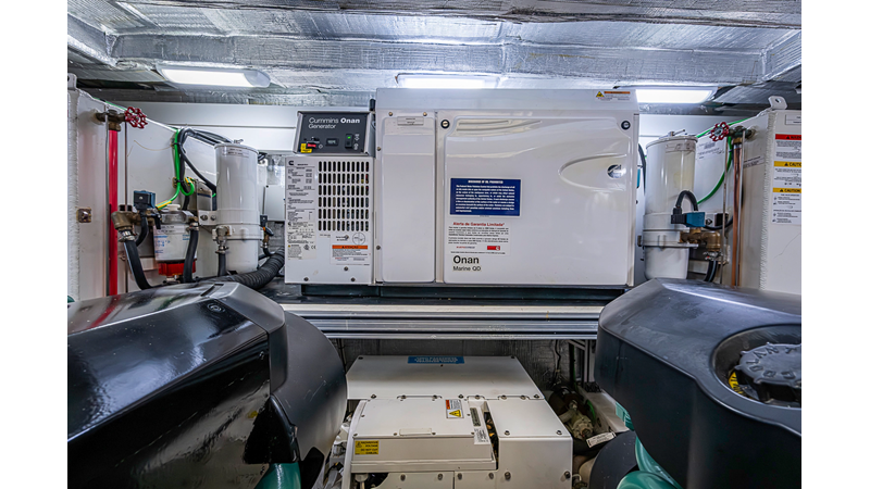 The current owner has further enhanced “Monarch” with a series of tasteful custom upgrades designed to improve storage, functionality, and onboard ambiance. The cockpit features an open layout with modular furnishings, creating a highly versatile social space ideal for entertaining guests or relaxing while at anchor. Additional overhead storage has been thoughtfully integrated into the galley, while the aft garage has been upgraded with custom composite cabinetry to provide organized and durable storage solutions. Completing the enhancements, blue LED accent lighting has been installed within the cockpit’s overhead terrace, creating a distinctive and inviting atmosphere for evening entertainment.