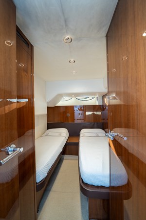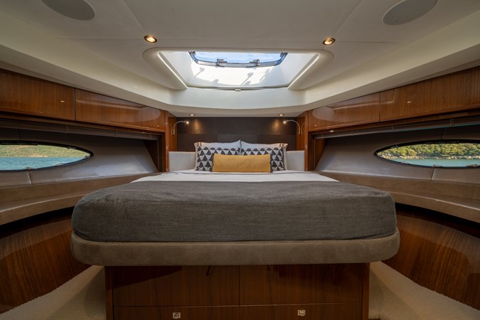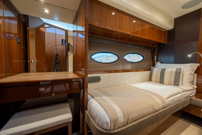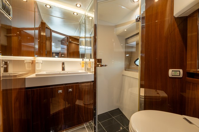 Below deck, the layout consists of four guest cabins and three ensuites. The master cabin is full beam, whilst the master ensuite is nearly 3/4 of the full beam of the yacht.