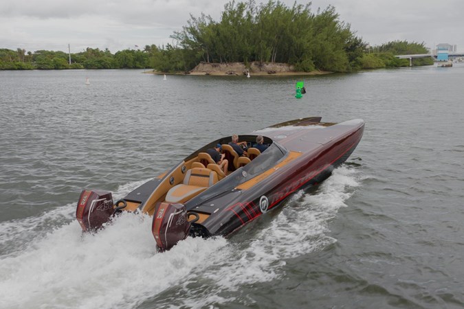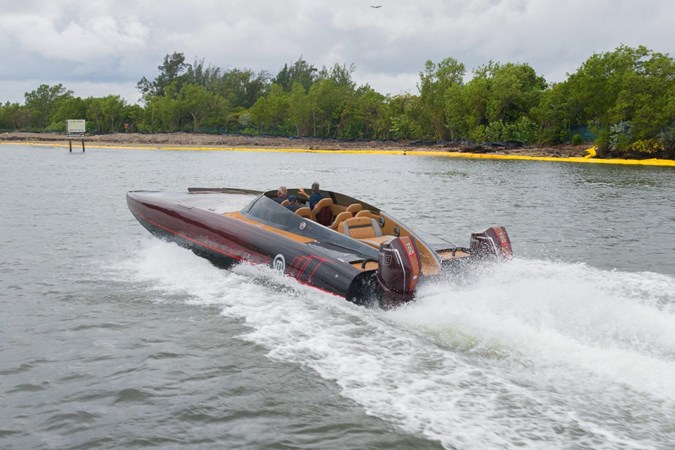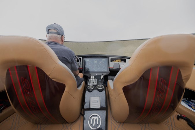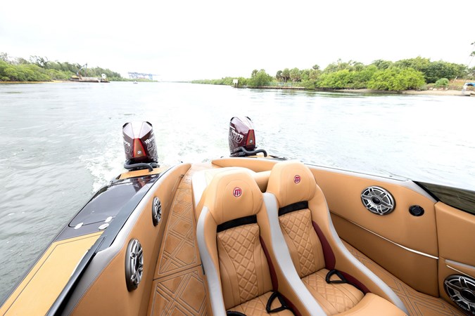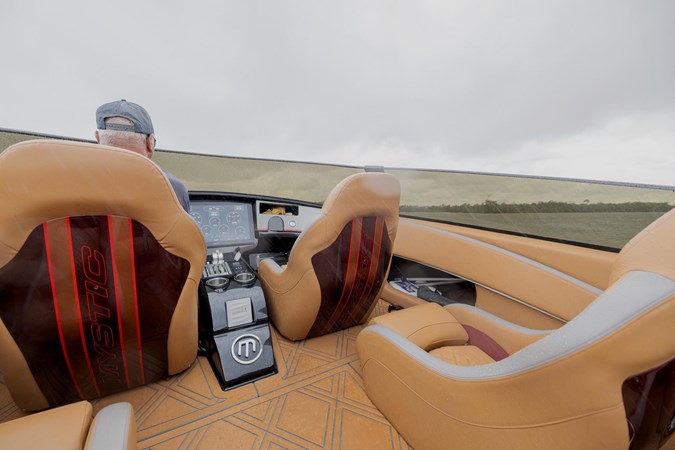 In this C4000 Mystic Powerboats has delivered a full carbon fiber hull and offers the rare combination of racing speed and luxury. The comfortable interior consists of 6 forward facing and two rear facing seats that still look brand new. The low positioning allows for a surprising amount of shelter from the wind as the boat glides along. The soft sea decking compliments the boat very well and also provides safe transit through the seating area.