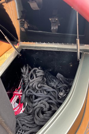 There are large storage compartments around the boat for lines and fenders