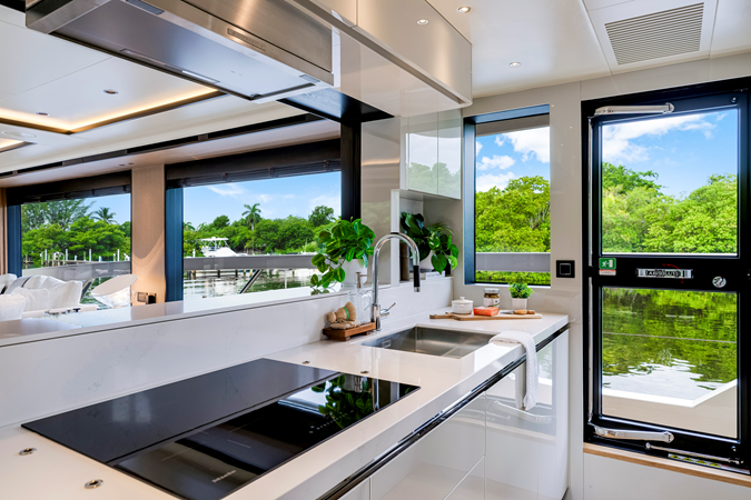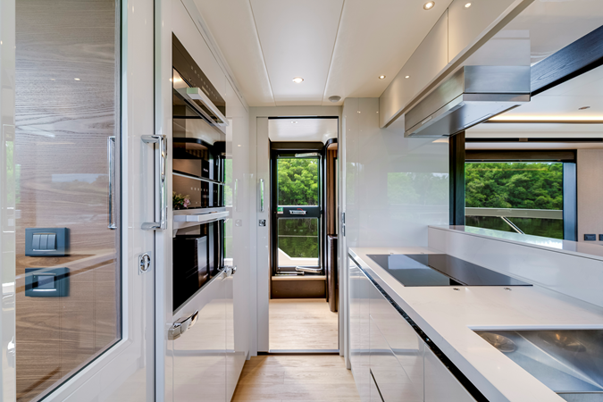 Navetta 75 displays the design innovations that make Absolute recognizable and admirable worldwide: surprisingly wide windows for an immersive visual experience, high ceilings, rooms arranged on a single deck and covered walkways accessible from the inside, both from the kitchen and from the raised helm station.