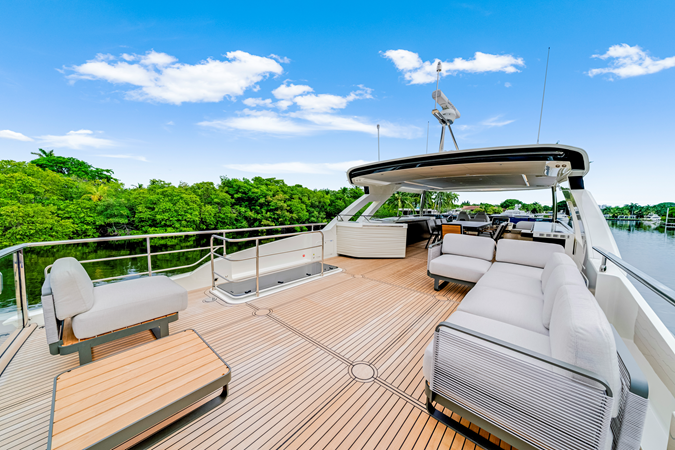 Already a success on Flybridge and Coupé range boats, Navetta 75 also features an aft terrace cockpit with a glass rear parapet; the owner will be able to furnish it as desired to enjoy breathtaking views from here.