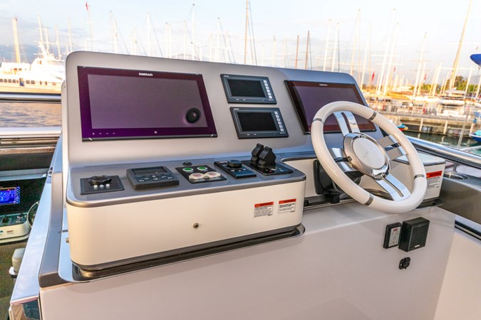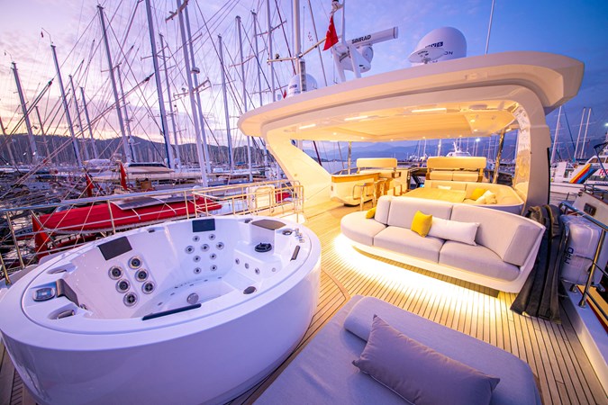 The spacious flybridge offers panoramic views, ample lounging, and an alfresco dining area with a bar. The aft deck provides a welcoming setting for entertaining, while the foredeck sun lounge offers plenty of seating and relaxation areas.
