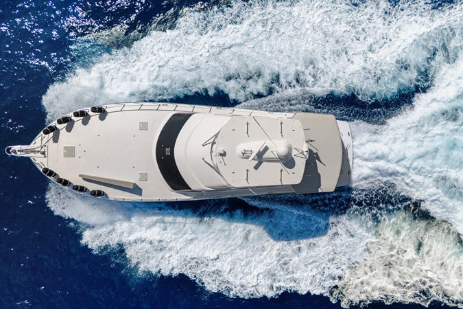 Notable features include a Nautical Structures 2200LB Davit with telescoping hydraulic rotation, an 8-man open-sea ISO canister life raft, and a performance capability exceeding 40 knots.