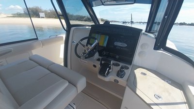 Step aboard and experience award-winning design and craftsmanship. Every detail of the 350 Realm exudes sophistication, from the luxurious upholstery, stylish oyster grey hull and black accents, to the innovative helm station and spacious deck layout.