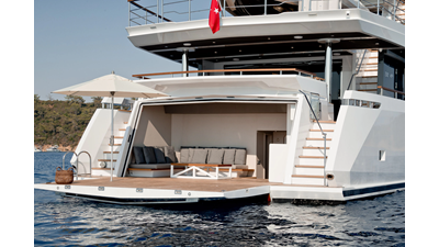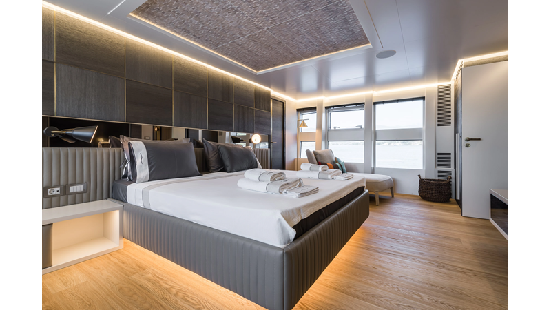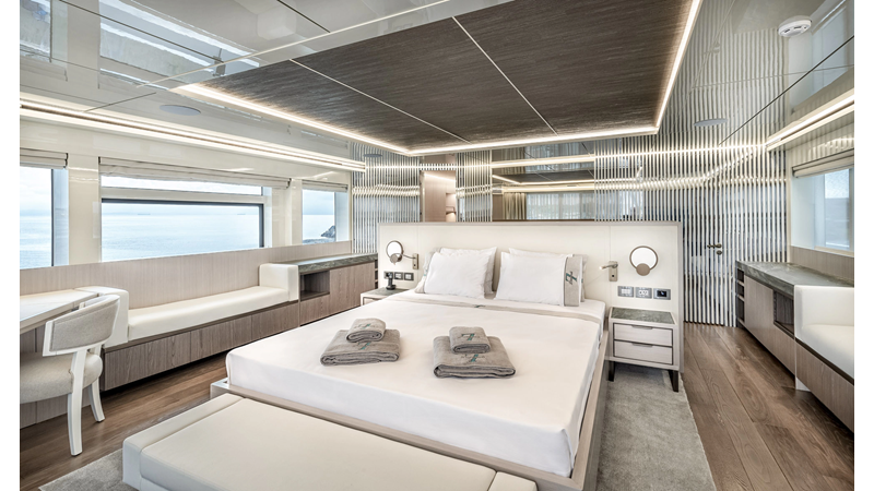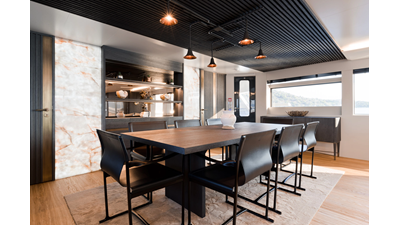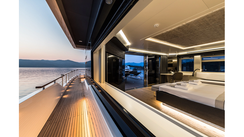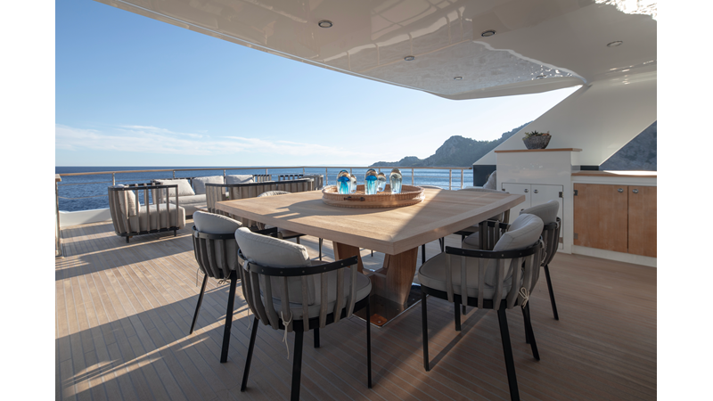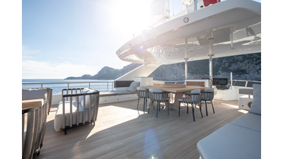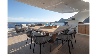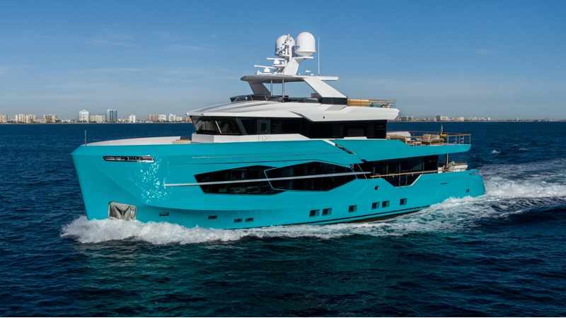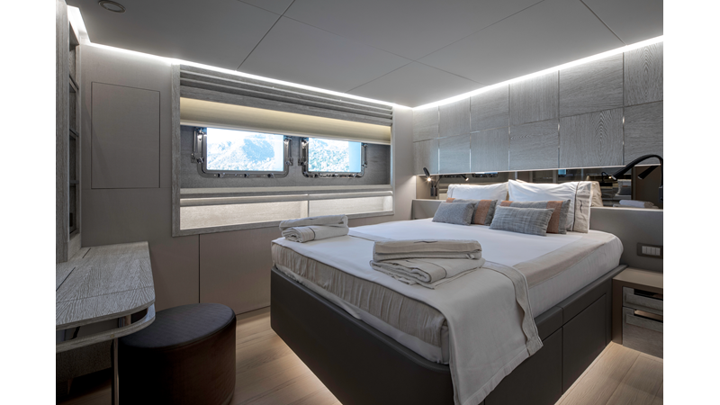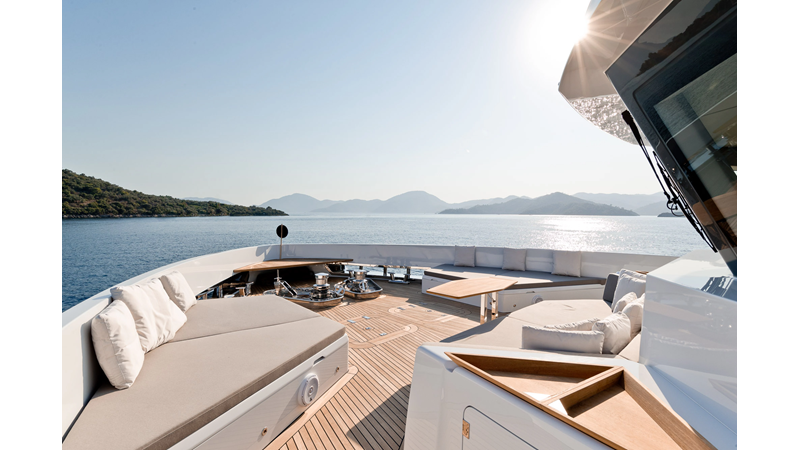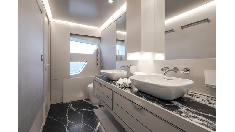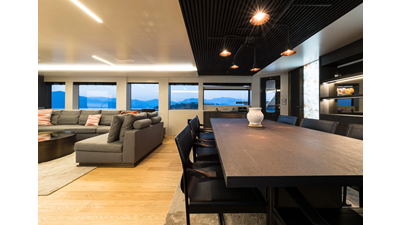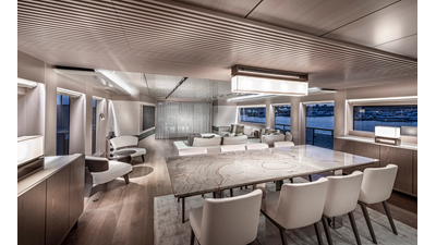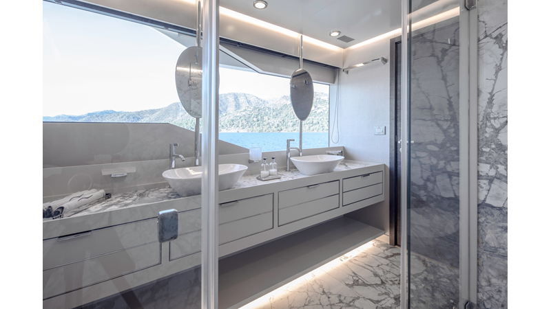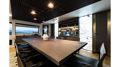 Opacmare Transformer IMO Tier III engines are an option and are essentially becoming required for new build deliveries in 2024 and later due to new EPA requirements. Her large open upper deck features a massive 2,500kg davit allowing you to carry up to a 8.5m tender plus additional water sports toys. (Hull #2 carries a 28ft Axopar on deck). A new layout created for North American clients features a country kitchen forward on the main deck allowing a more casual gathering place for guests and crew for meals.