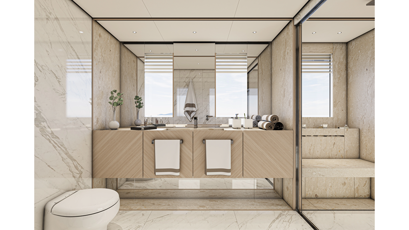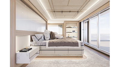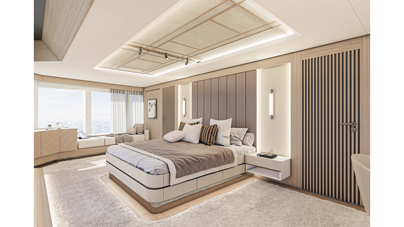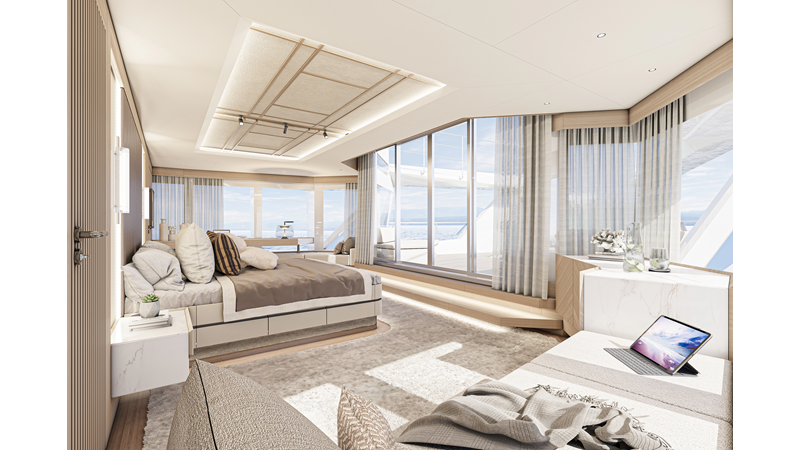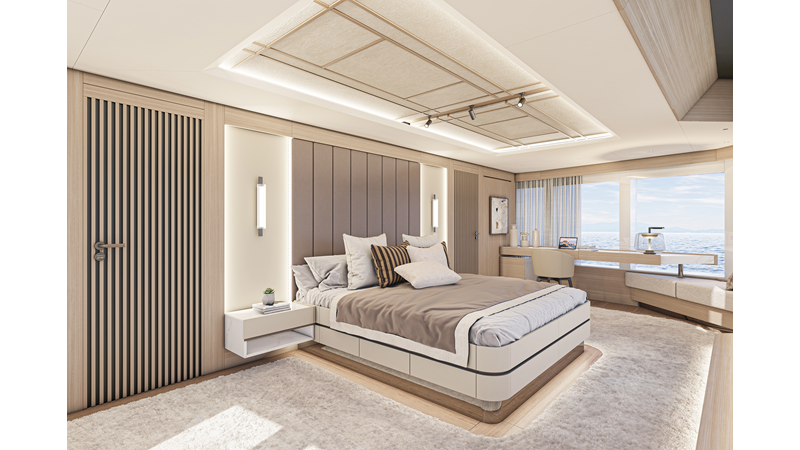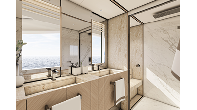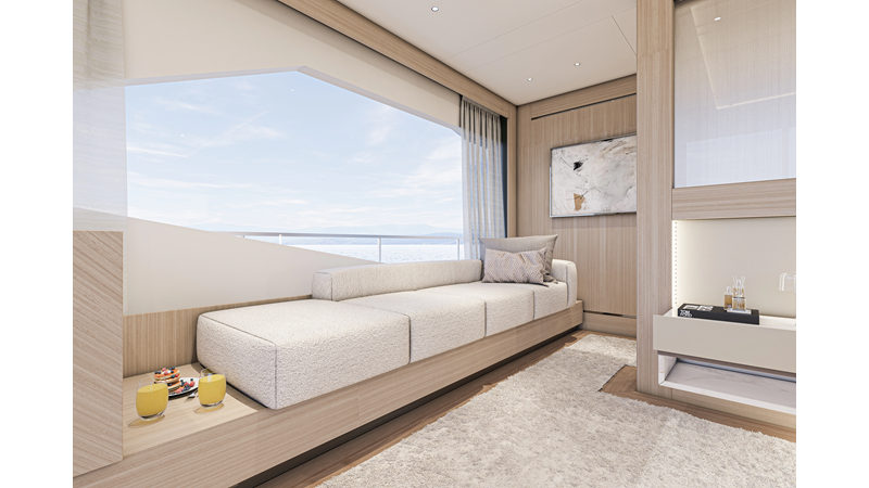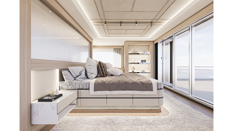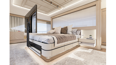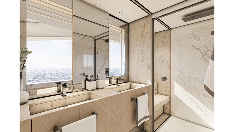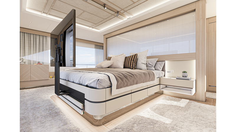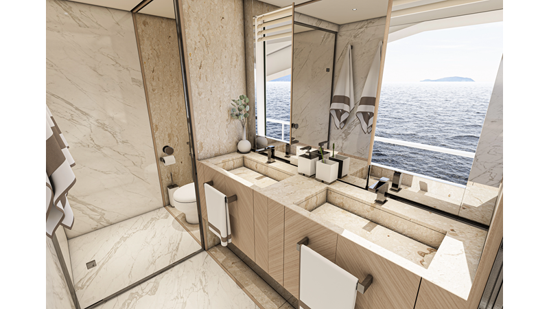 The 45XP is a ground breaking design not just with her sleek profile lines, but also due to the forward facing master cabin complete with private exterior deck, jacuzzi with waterfall feature, and floor to ceiling glass windows. A true master piece with the interior decor being developed by world renowned Milan based design studio Hot Lab.