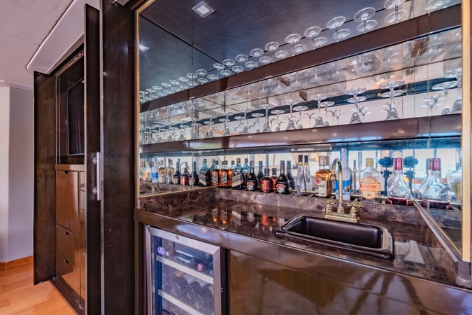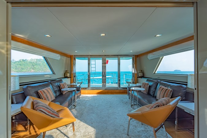 NYMPHAEA boasts exceptional social areas both indoor and outdoor. Her full beam double salon and main dining/sitting area is unique for a yacht of her size, combining vast social spaces with ample daylight and excellent views, especially from the full height sliding windows in the entrance lounge. The large upper deck outdoor area is equally impressive with a hard-top shaded sitting/dining area accommodating up to 10 guests, followed by an expansive lounging area with wide views of the surroundings, and well-shaded when needed by two large removable canvas covers.