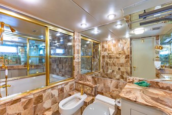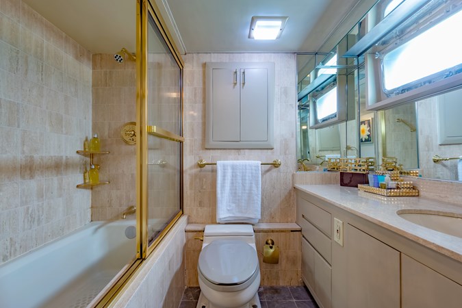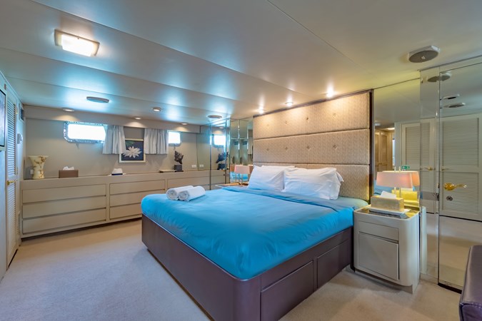 Guests accommodations comprise 3 suites for up to 7 people: a full beam master bedroom with his and hers bathrooms, a queen bedroom and a twin bedroom with a third pullman bed, both with en-suite bathroom. Ton the main deck, the galley and adjacent crew mess are very spacious, allowing to prepare complex meals and optimise table service.