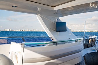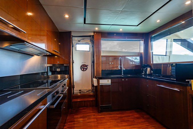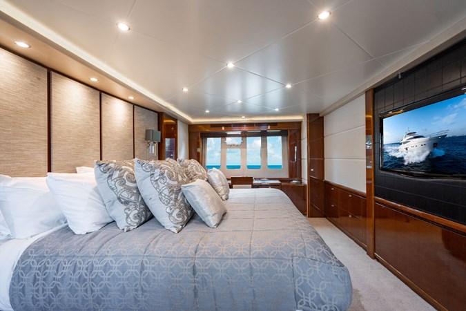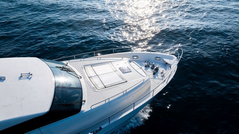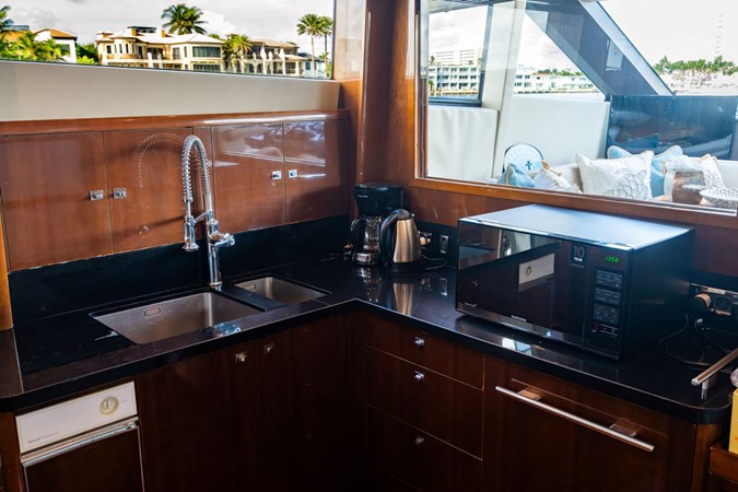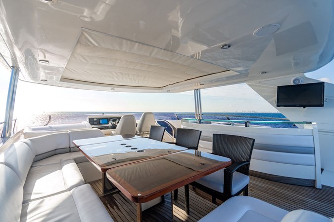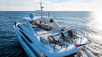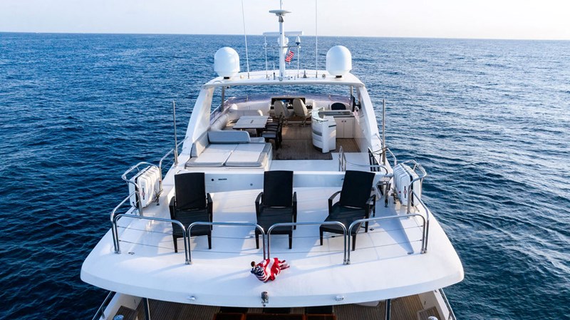 - Spacious flybridge with wet bar, grill, and sunbathing areas