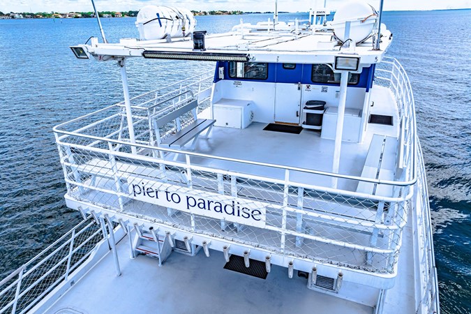 She is equipped with twin Lugger 700hp Diesel Engines that offer a cruising speed of 11 knots and top speed of 20 knots. If you need air conditioning while anchored out, there is a Northern Lights 20kw generator. The captain is meticulous with mechanics so service records are current and complete. This vessel is very solid with an aluminum hull, and she will cut through 4' to 6' chop with no problem. The bridge helm is equipped with a complete electronics package including two Garmin GPS screens, Garmin Radar, Robertson Auto Pilot and Rudder Indicator. In addition, there is a separate docking station to Port and another docking station to Starboard so your captain can maneuver this big cat with ease.