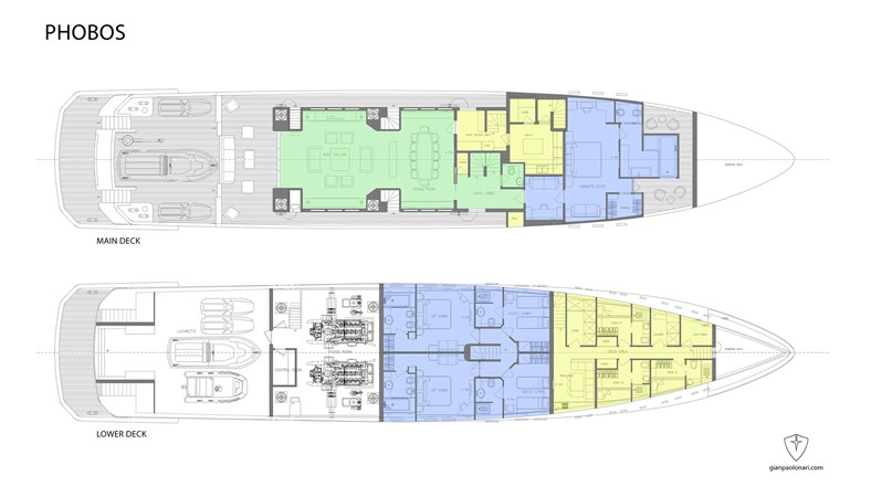 Crew spaces are designed with guest privacy and service efficiency in mind, including three double cabins forward and a dedicated captain’s cabin adjacent to the wheelhouse. Generous storage and technical areas ensure that PHOBOS is prepared for extended cruising and exploration.