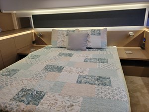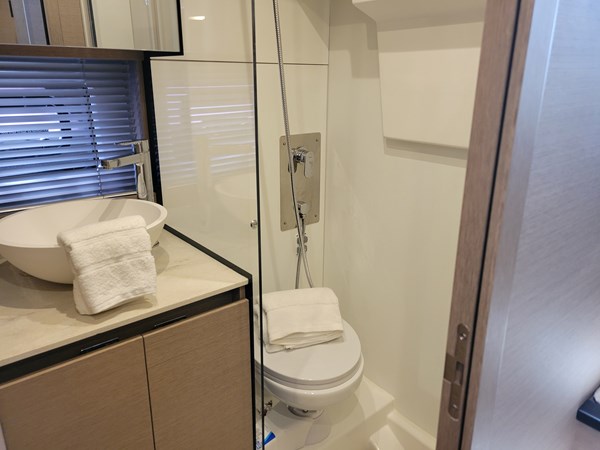 Large side windows and a multi-panel sliding glass door to the aft deck permit stunning views of surrounding waters from the salon and plenty of natural illumination, whether you are preparing meals at the modern galley aft, operating the vessel from the lower command station to starboard, or enjoying the view underway and keeping the helmsman company while sitting in the convertible lounge forward to port.