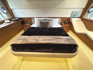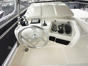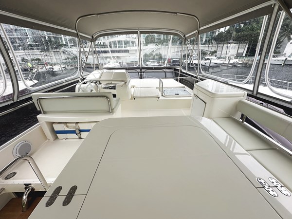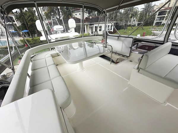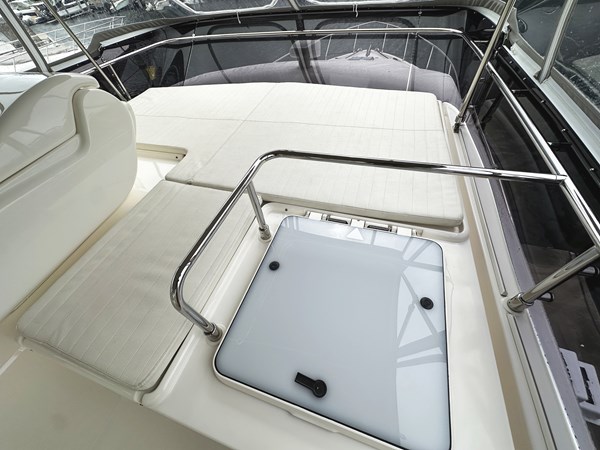 The flybridge of PRIMO is a standout feature offering a spacious area for outdoor entertainment and relaxation. It includes a helm station, a dining table, and comfortable seating, all within sturdy Bimini top and strataglass enclosure. The flybridge is also fitted with a wet bar and refrigerator making entertaining a breeze. The aft cockpit features an open bar to the galley, additional seating and dining space, and easy access to the swim platform for water activities.