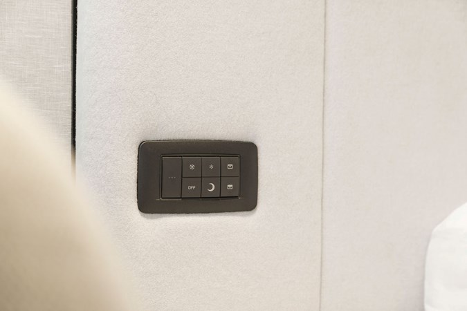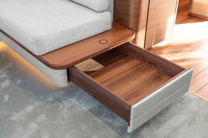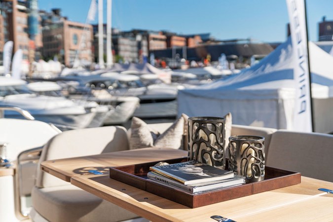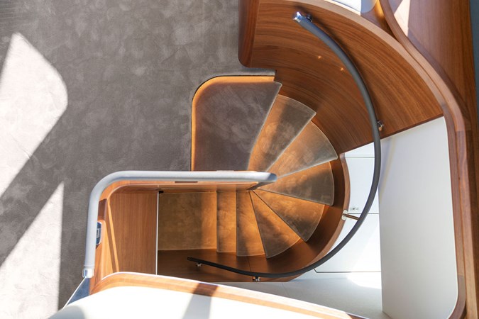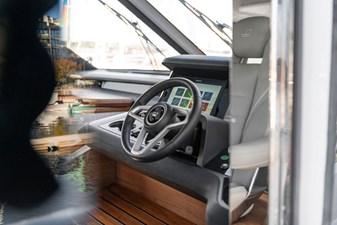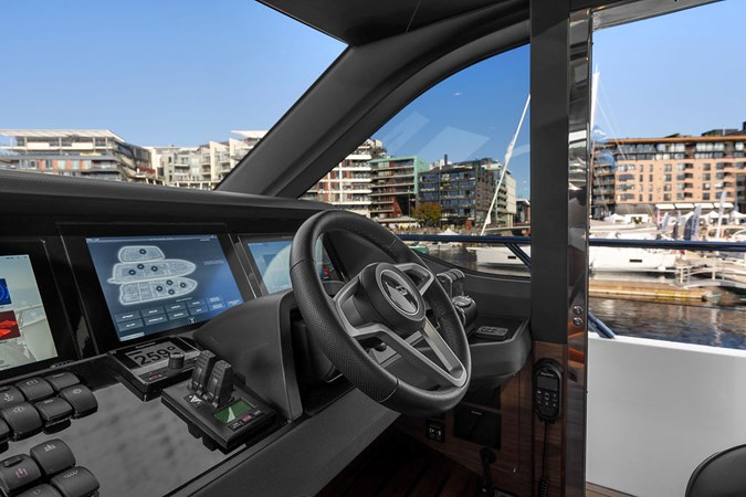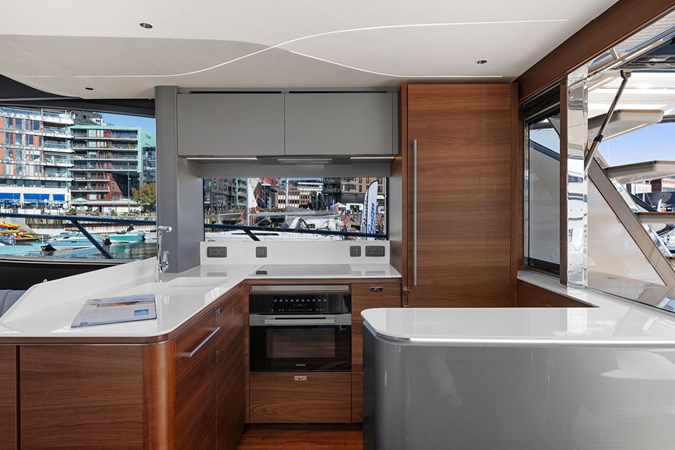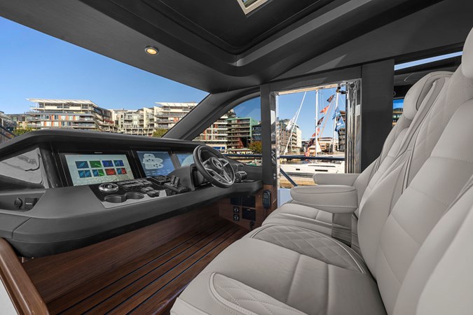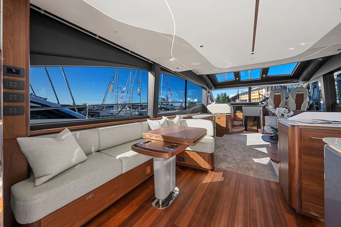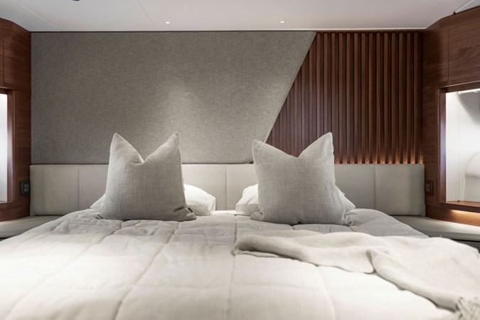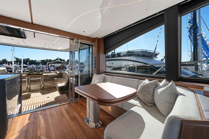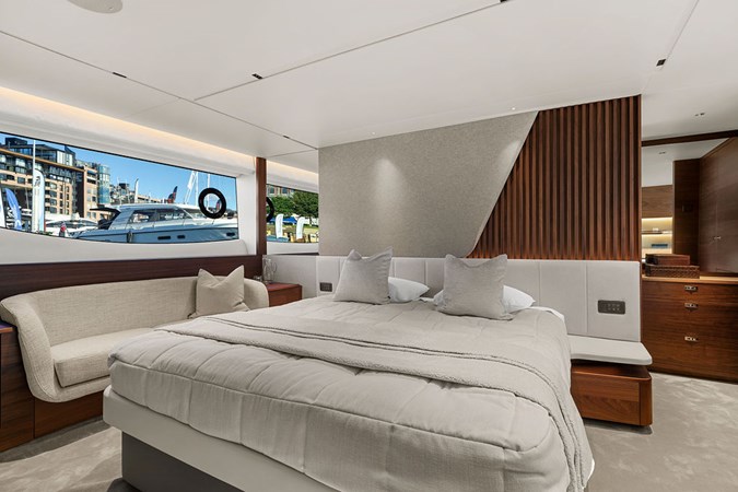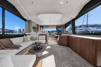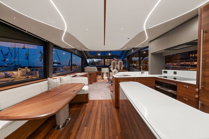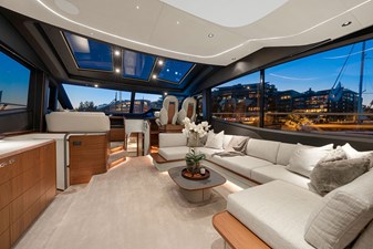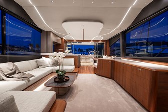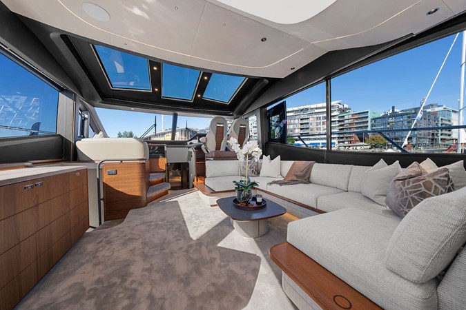 The exterior styling is sleek and purposeful, featuring expansive sun pads fore and aft, a hydraulic bathing platform, and a seamless cockpit layout ideal for entertaining. Large panoramic windows flood the interior with natural light, creating a bright and elegant atmosphere throughout.