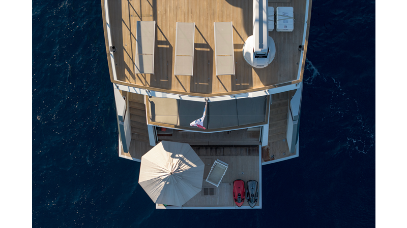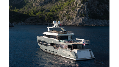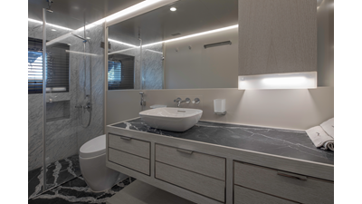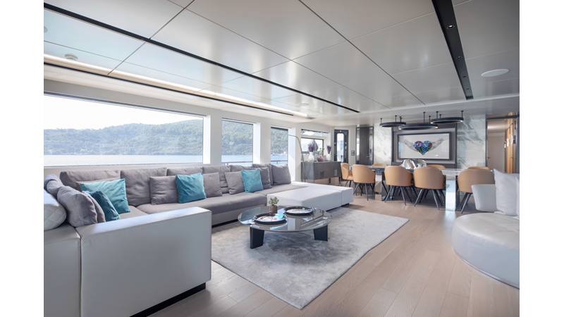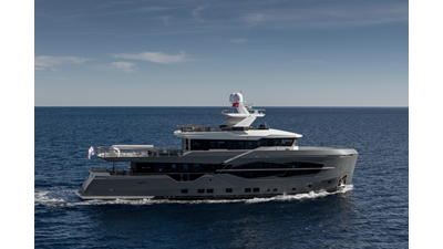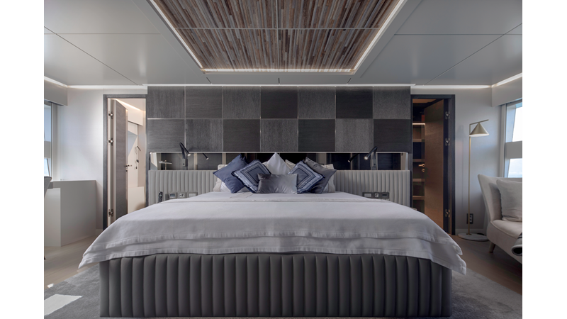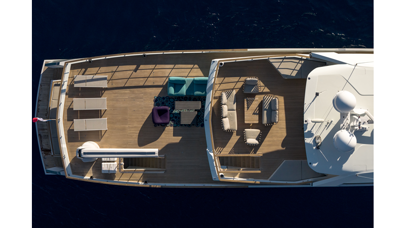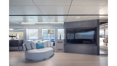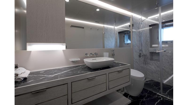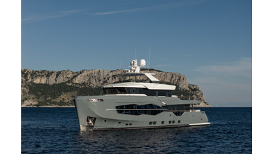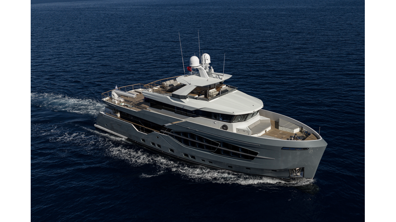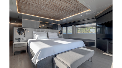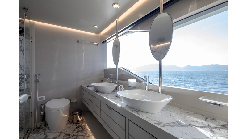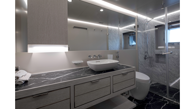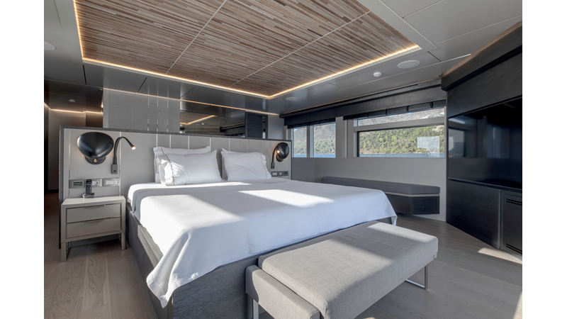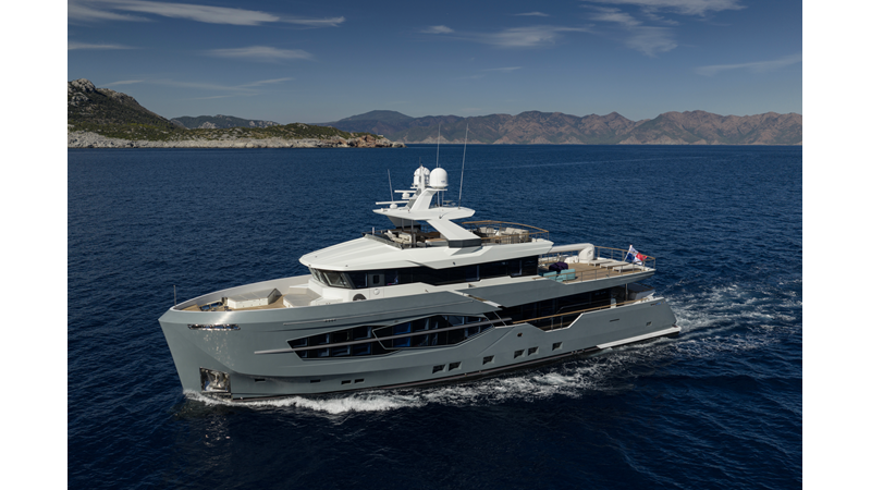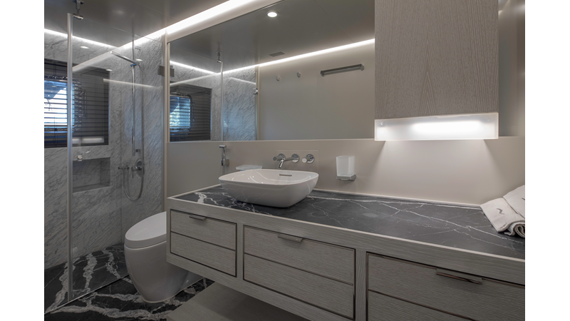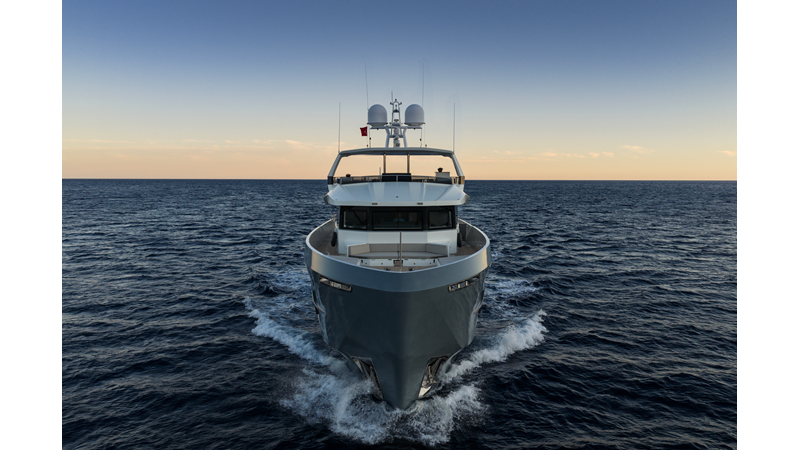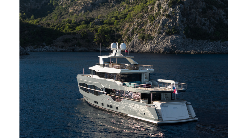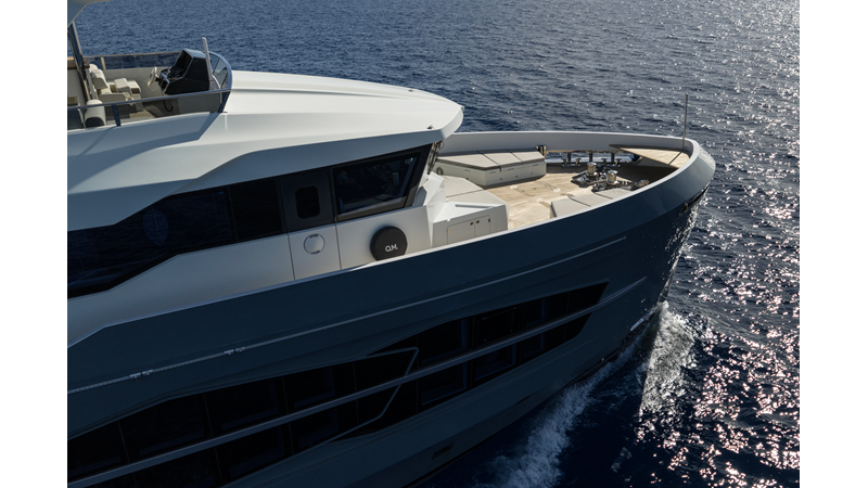 Her bold lines are highlighted by a plumb bow painted in a striking ghost gray, forward raked windows, and large glass windows. Equally stunning as she is capable, QM has a 4,000nm range & can carry a best-in-class number of tenders & toys on deck thanks to her 3 ton davit on the boat deck.