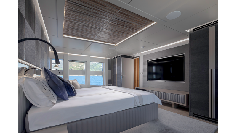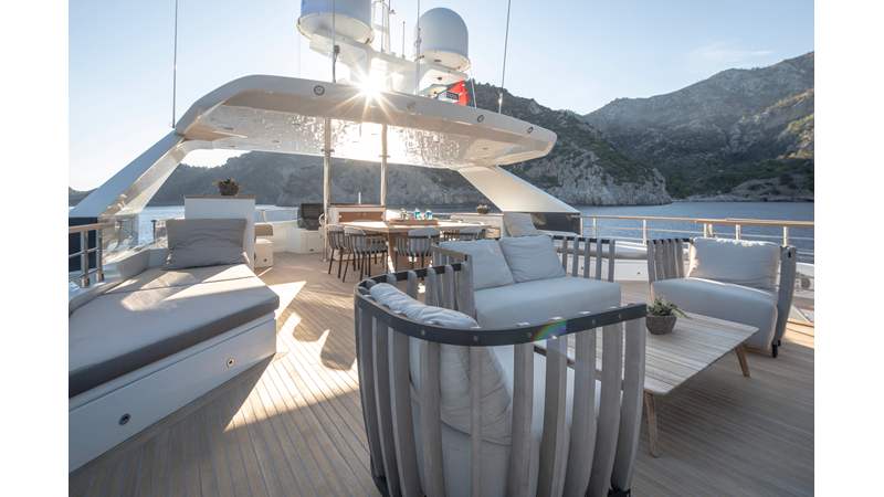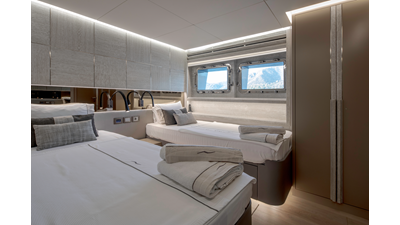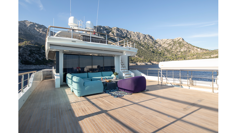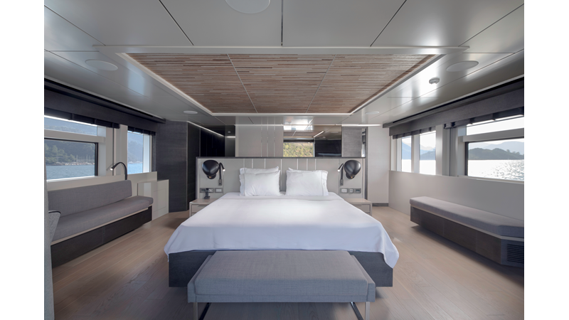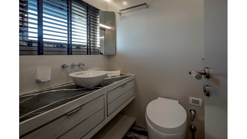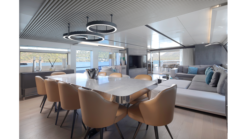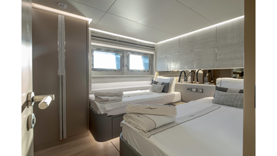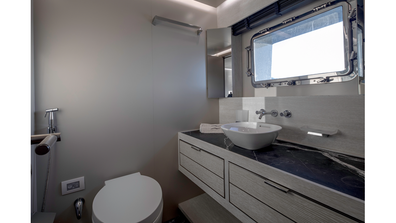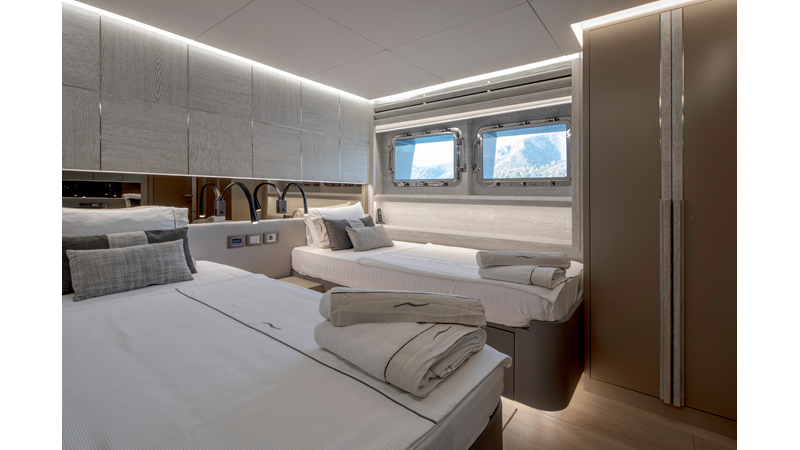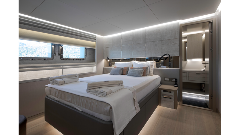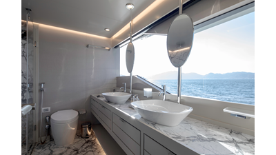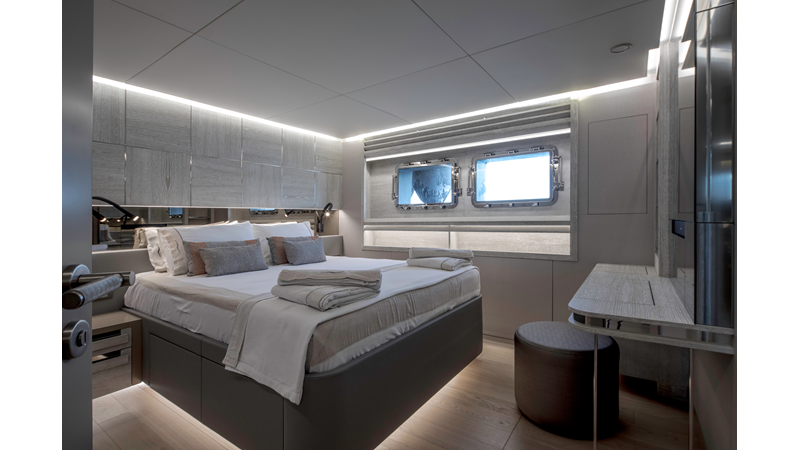 She was custom ordered by the owner and features a stunning, family friendly interior decor by Esra Kasmirci that features warm earth tones throughout. To encourage large family gathering, her layout consists of 6 cabins that sleep 12 guests including a private owners deck on the upper level, a main deck VIP that could double as a second master, and 4 additional cabins on the lower deck.