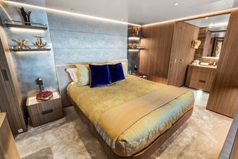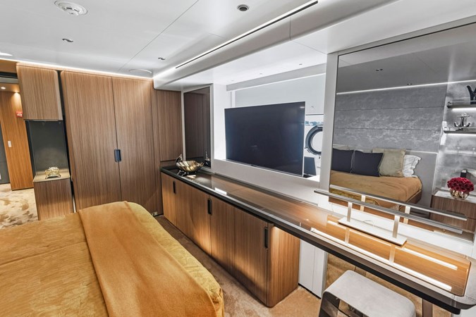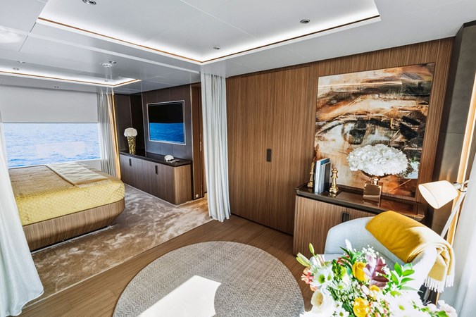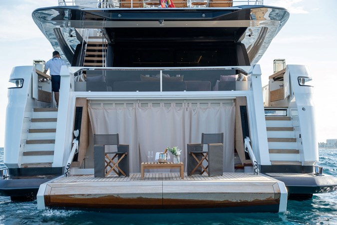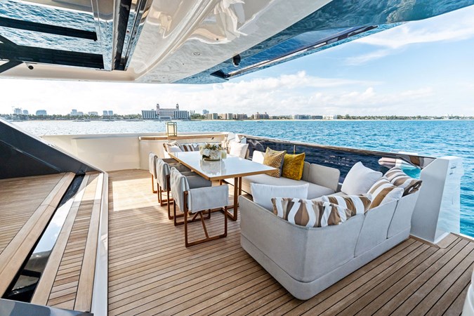 The yacht features sleek, contemporary exterior lines that are instantly recognizable as Custom Line, along with expansive glazing that allows natural light to flood every space. Designed for both private ownership and high-end charter potential, it strikes an impressive balance between indoor and outdoor living.
