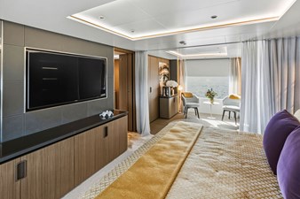 The main salon is spacious and inviting, with panoramic windows that create a seamless connection to the sea. The thoughtfully arranged lounge and dining areas make the space suitable for both relaxed cruising and elegant entertaining. High-quality materials, fine wood finishes, and intricate detailing reflect Custom Line’s commitment to craftsmanship and timeless design.