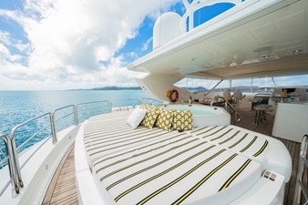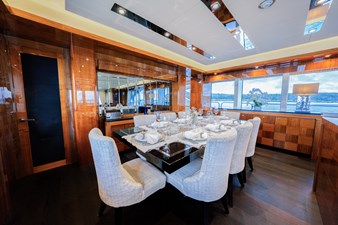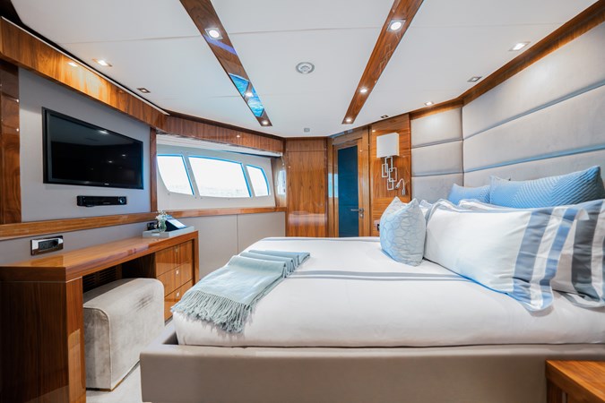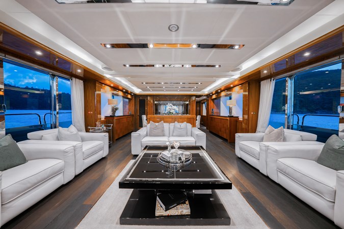Expansive deck areas include a sun-soaked flybridge with a jacuzzi, bar and shaded dining. The bow offers oversized sunpads, while the aft deck provides seamless indoor-outdoor flow for alfresco dining and lounging.Contemporary, Light-Filled Interiors