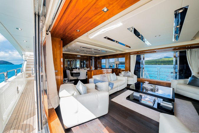 The main saloon and formal dining area are framed by large picture windows, filling the space with natural light and ocean views. Soft-toned furnishings and clean architectural lines create a sense of calm sophistication throughout.Water Sports Ready