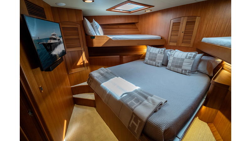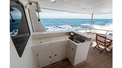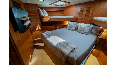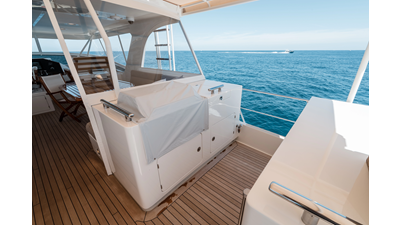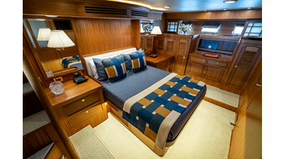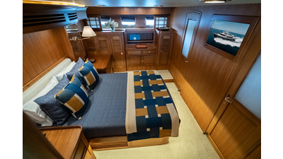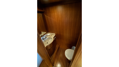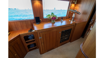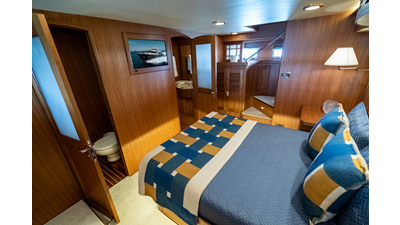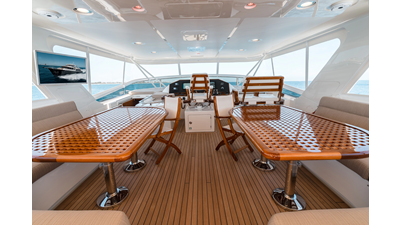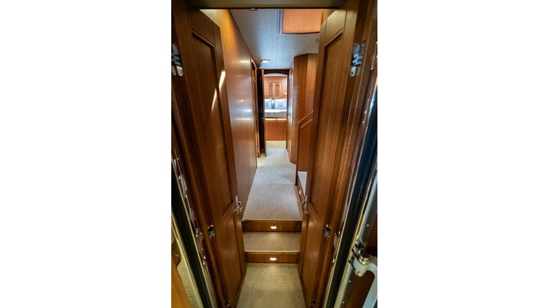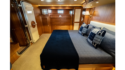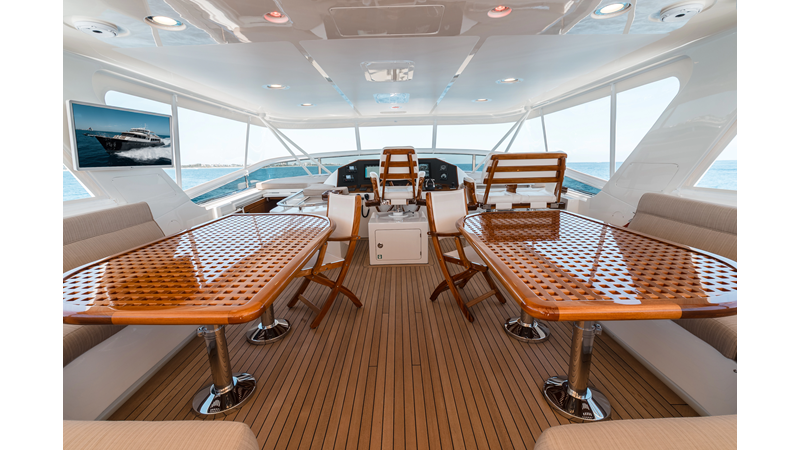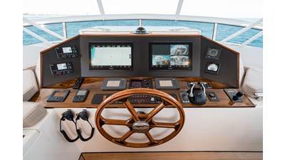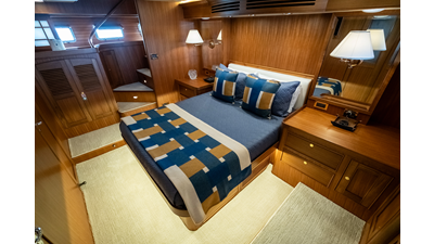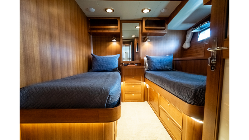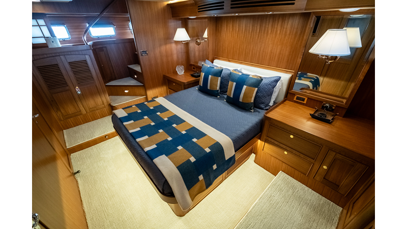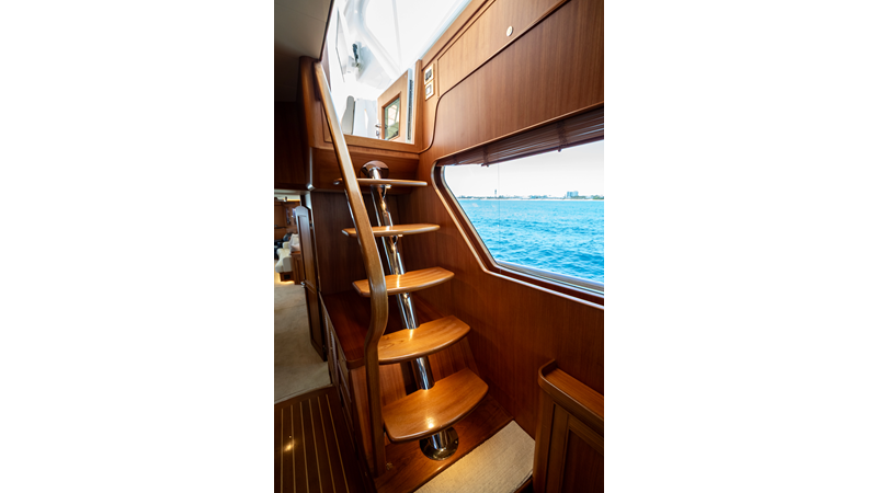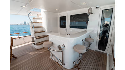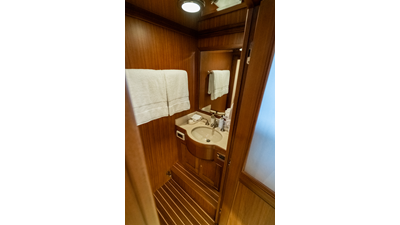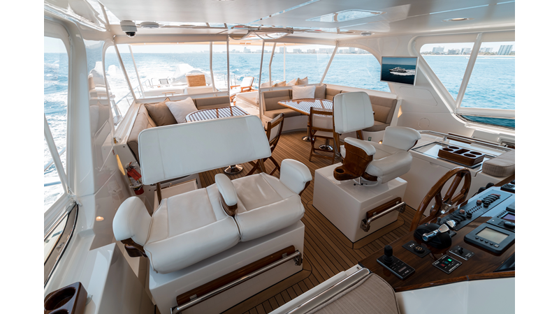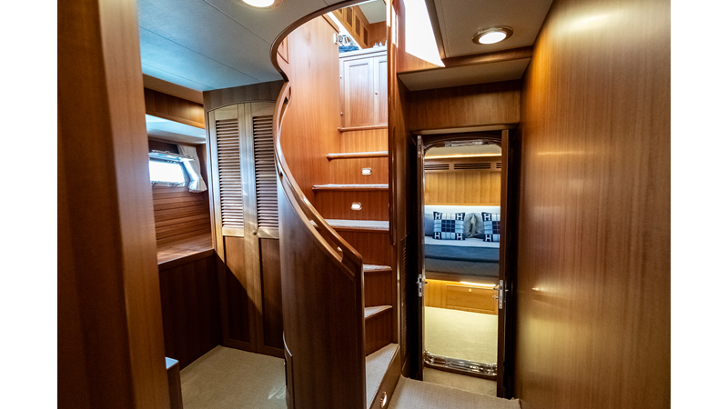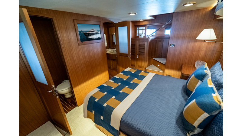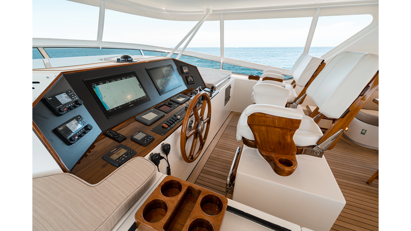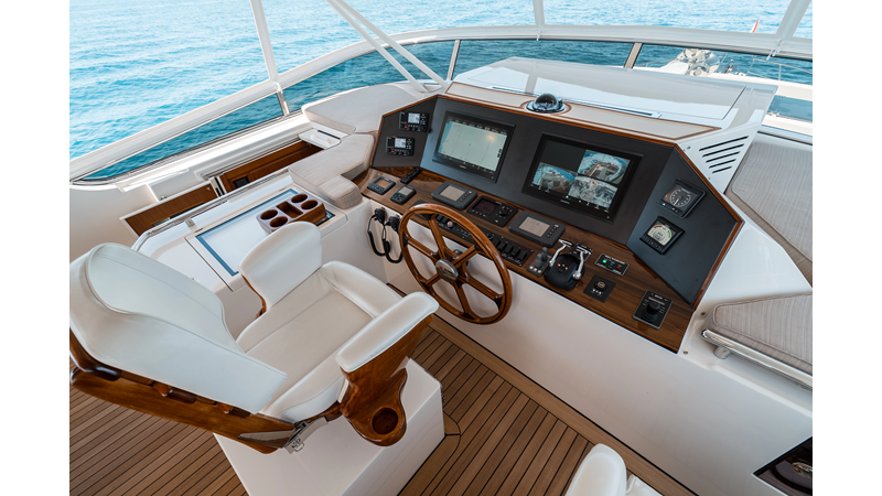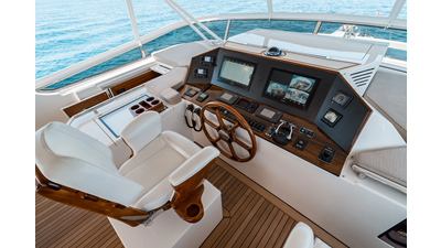 She has both the preferred open flybridge arrangement with upper and lower helms as well as the 4 cabin layout with two full-beam staterooms.The fully serviced CAT C32s provide a 20-knot cruise and top speed of 25 knots.
