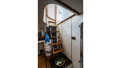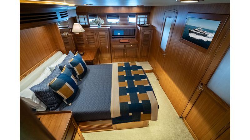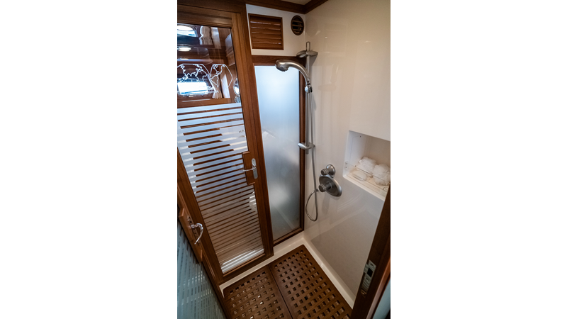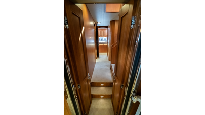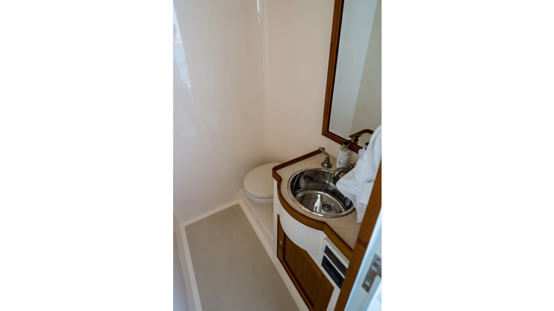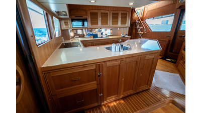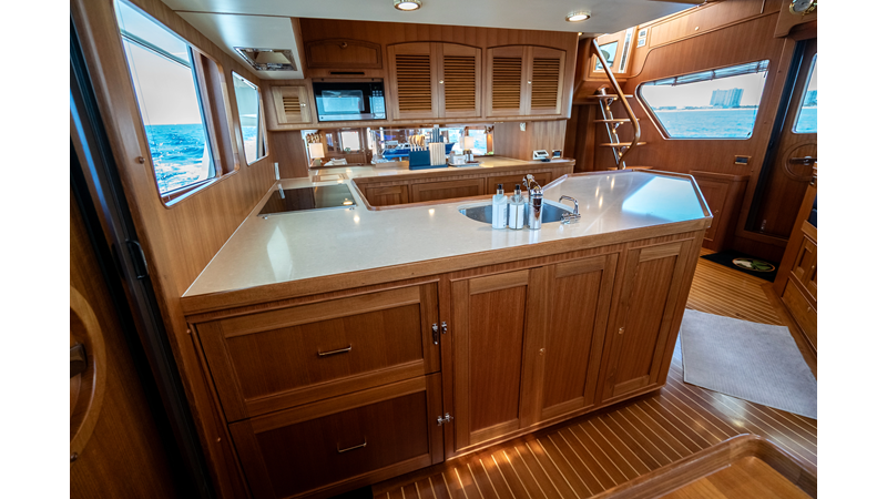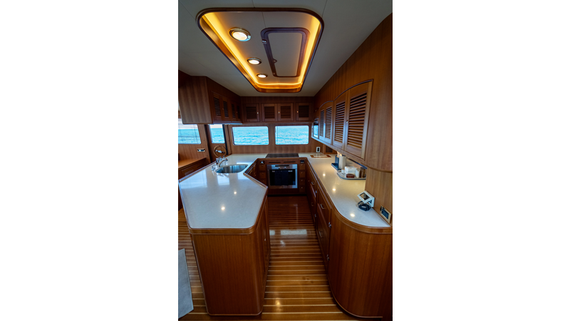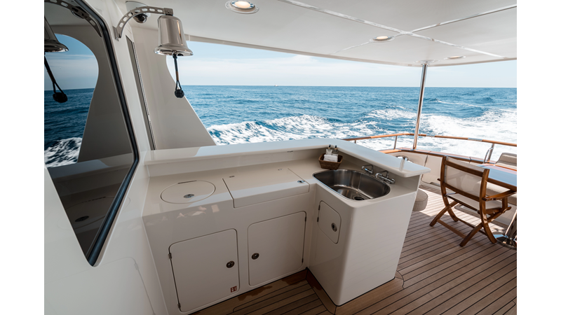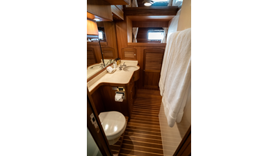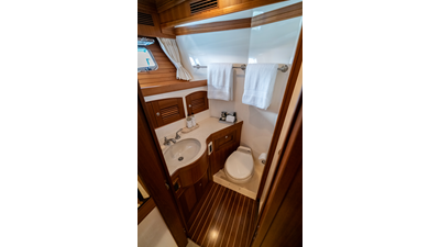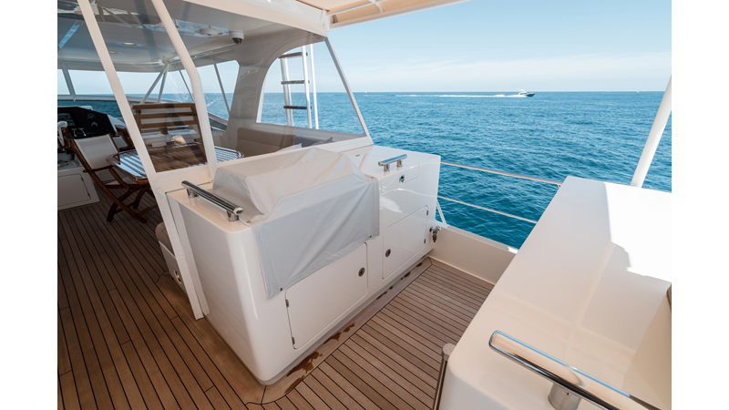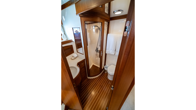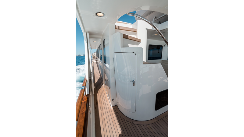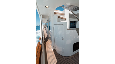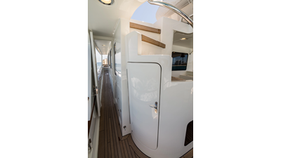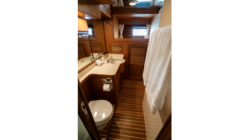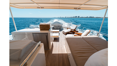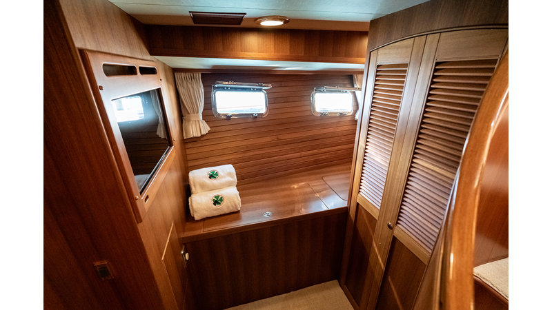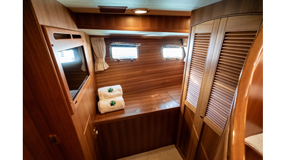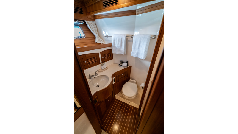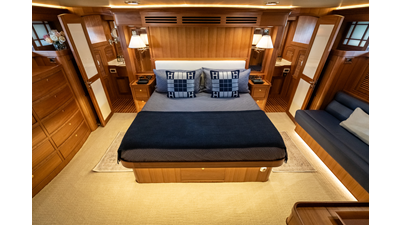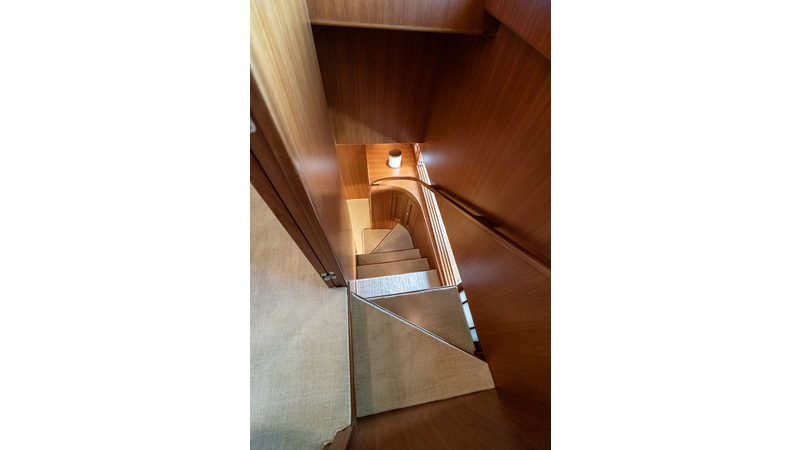 She has both the preferred open flybridge arrangement with upper and lower helms as well as the 4 cabin layout with two full-beam staterooms.The fully serviced CAT C32s provide a 20-knot cruise and top speed of 25 knots.