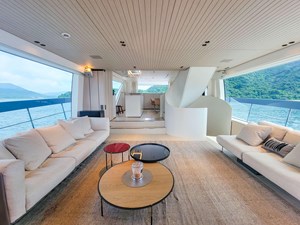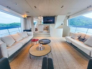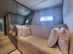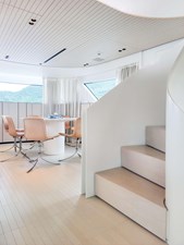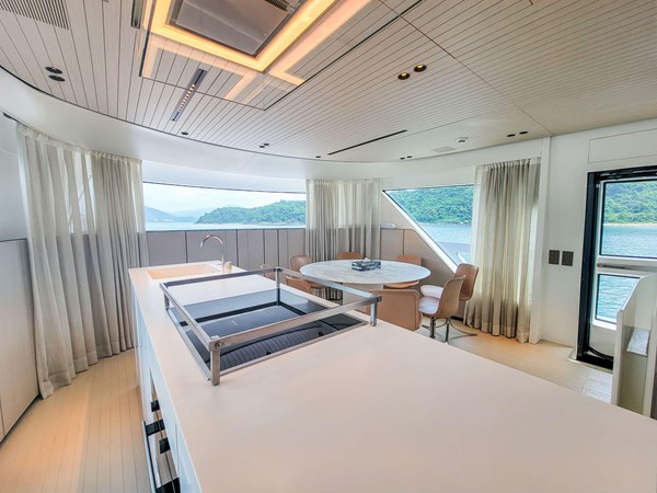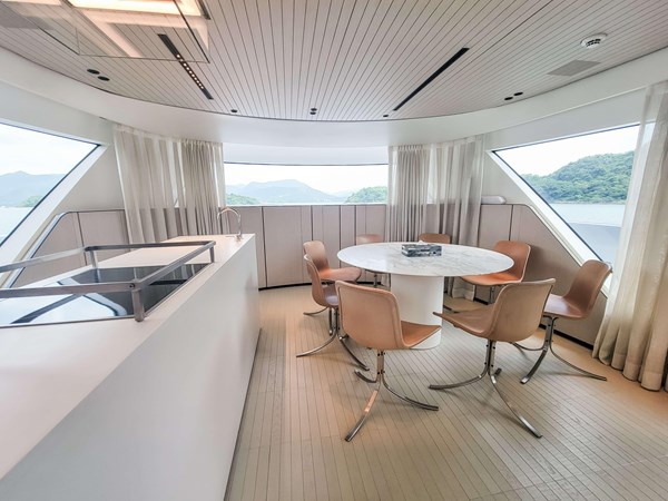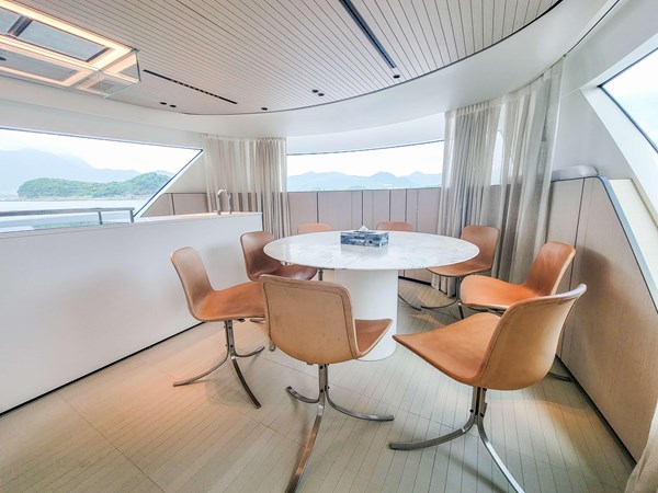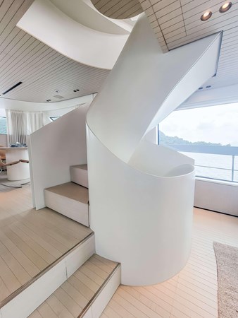 This Lissoni Edition SX76 is different from the classic SX76. The designer reimagined the layout and the use of space at both the main and lower decks. Entering the saloon from the cockpit, it is immediately noticeable that there are no structural walls impeding sightlines within the yacht, rather you will notice an eye-catching spiral staircase and plentiful usable open spaces. Thanks to the full-size windows to the port and starboard sides of the saloon, the space becomes bright and welcoming. Guests are connected with the open sea without any obstructions. Within the airy main deck, there is an aft living area with a TV for guests to enjoy, and an eight person round dining table next to the open kitchen in the forward area for guests to enjoy their gourmet meals with smiles and laughter.