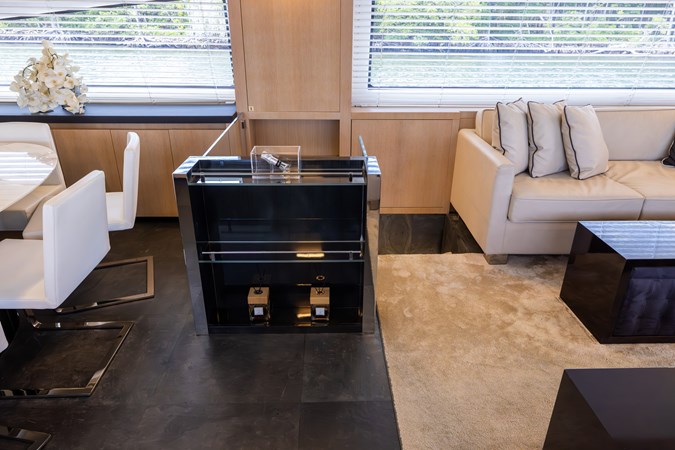 Sea Metri V was built and designed with meticulous care for efficient cruising speeds, incorporating technically advanced weight saving construction methods and materials as well as to technical aspects for balance. Her light-weight planing hull (64 tons) with triple “tried and true” Volvo Penta D13-900(hp) IPS 1200 engines (pod drives), enable Sea Metri V, according to the builder’s claims, a 20% more efficient vessel over like size production yachts with larger engines and conventional drives. She has easy maneuverability, quick steering response, steadiness and low noise and vibration. She cruises at 20 kts. burning 100 gallons/hr., with a top speed of 26 kts. burning 135 gallons/hr. Her hours are low (780) and has been very well maintained. Sea Metri V will be located in a FTZ slip for easy viewing access.