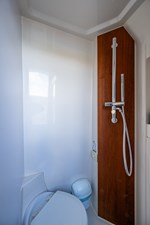 When you step down into the large console you have a berth forward as well as a stand up head and shower aft