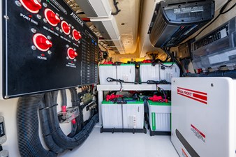 At the helm she has 3 22" Garmin screens custom mounted on a "Glass helm style" dash. Her triple release helm chairs with fold down arm rests and AC vents on the dash ensure you will stay comfortable on any cruise you are taking.