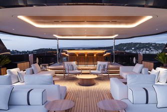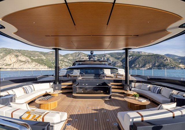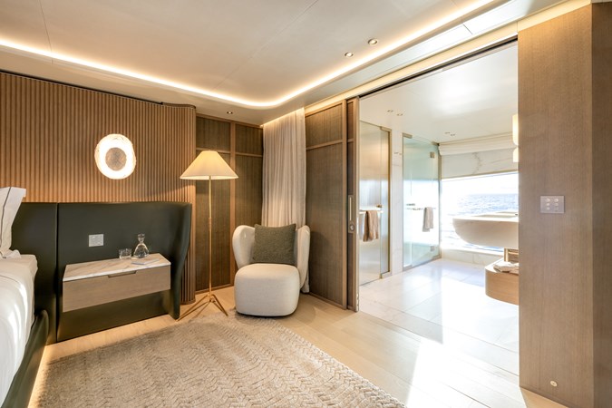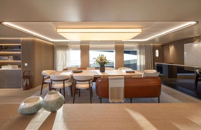 Designed by Meyer Davis with subtle New York influence and inspired by sun, sea, and sand, her interiors exude relaxed luxury with a focus on natural textures and sustainable design. Her striking low-profile exterior by Fulvio De Simoni Yacht Design features three exceptional outdoor living spaces— an aft cockpit with a tranquil pool, an expansive sundeck for effortless lounging, and a versatile bow area with a hidden pool that transforms into an open-air cinema. Solar integration and lightweight construction further elevate her efficiency while keeping luxury uninterrupted.
