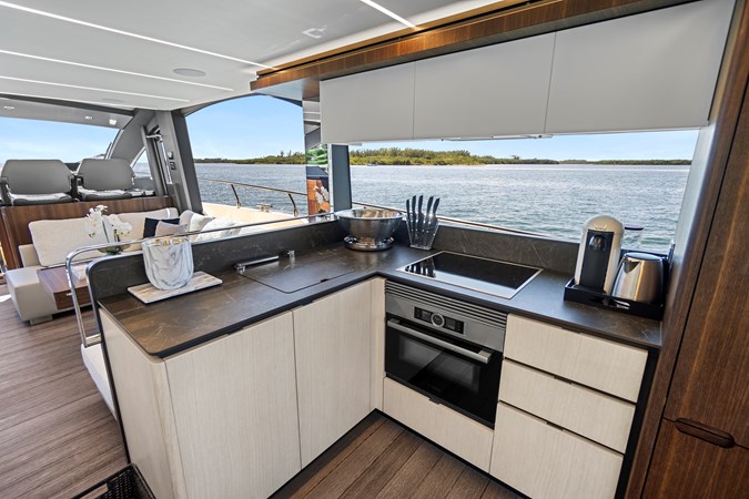- Flybridge with large seating and dining area, BBQ, refrigerator, ice maker and sink
