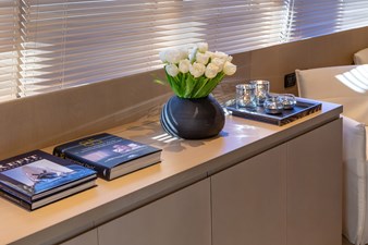 Her interior is sleek and modern, featuring a neutral colour palette throughout that creates a calm and elegant atmosphere. She accommodates up to 12 guests in 6 well-appointed cabins, comprising a Master Suite, a VIP cabin on the Main Deck that can be converted into a playroom, and four twin cabins, all convertible into doubles upon request, each with en suite facilities.